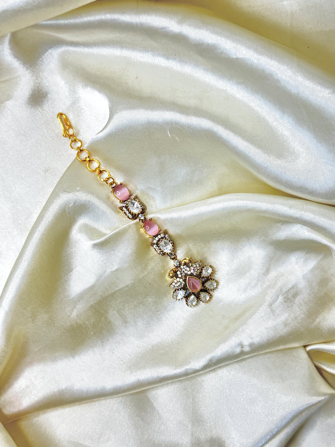Peacock-Inspired Pink Stone Maangtikka with Floral Accents