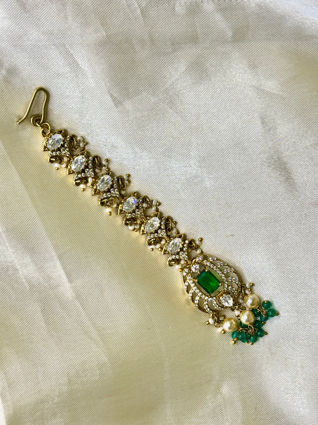 Victorian Crystal Maangtikka with Green Stone & Bead Accents