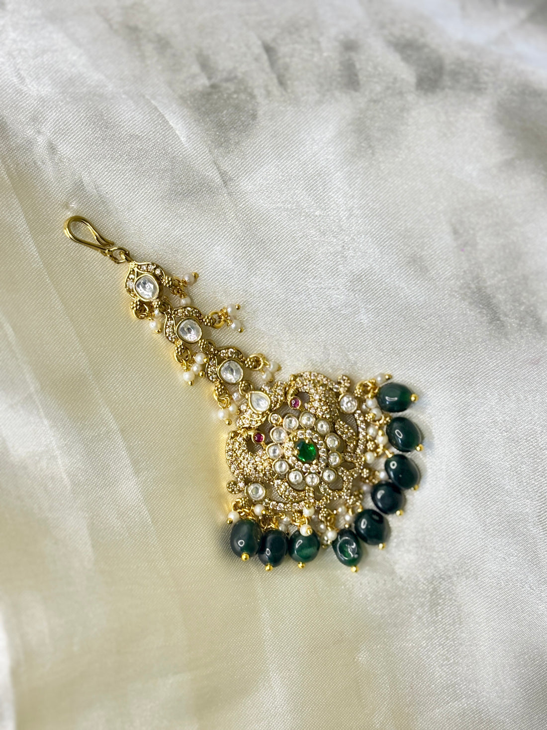 Exquisite Peacock Maangtikka with Crystal Stones & Green Beads