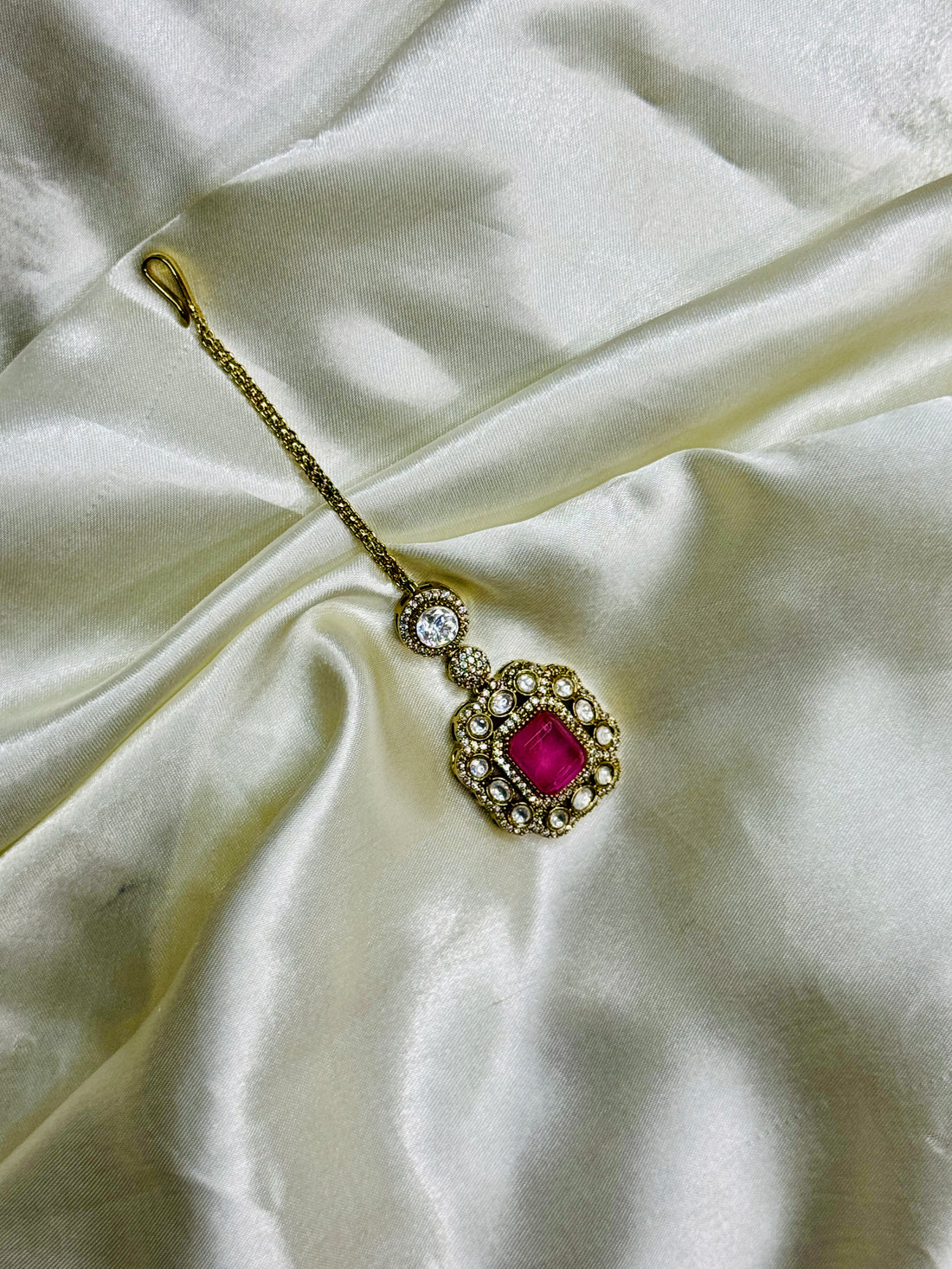 Embrace timeless beauty with this Victorian-style mangtikka, featuring a delicate pink stone as its centerpiece....