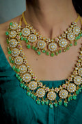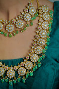 Introducing the Antique Blossom Duo, an exquisite combo set that brings together tradition, grace, and timeless design. This set features a delicately handcrafted short choker necklace paired with a coordinating long necklace, both adorned with soft pastel green floral motifs and finished in an elegant antique gold tone. The floral elements lend a subtle charm, while the pastel hue keeps the look fresh and sophisticated. Whether layered for a regal bridal look or worn individually for subtle elegance, this set is perfect for weddings, festive events, or traditional celebrations. Crafted with premium materials and finished to perfection, it's a must-have for those who appreciate vintage-inspired jewelry with a modern pastel touch.
