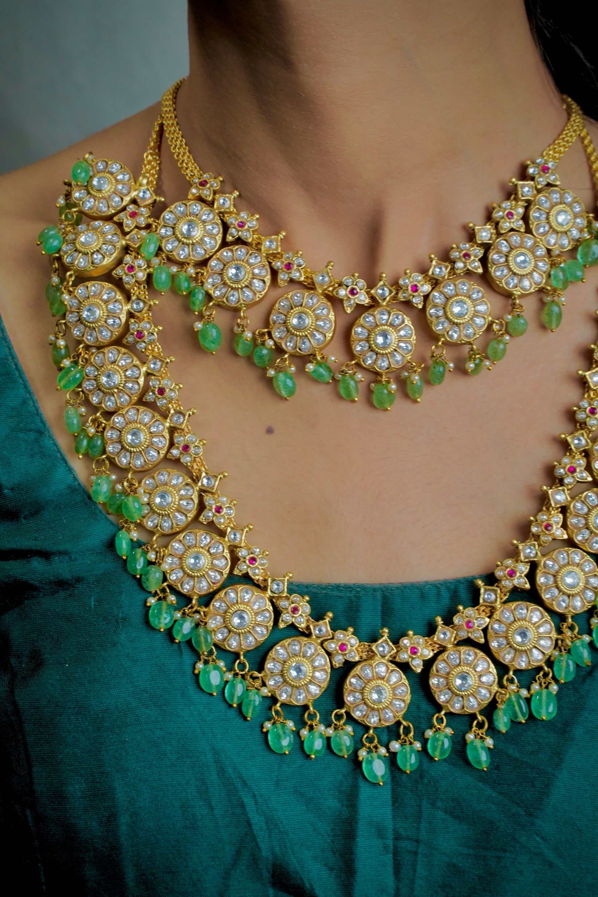 Antique Blossom Duo β Pastel Green & 18k Gold Floral Necklace Set (Choker + Long)