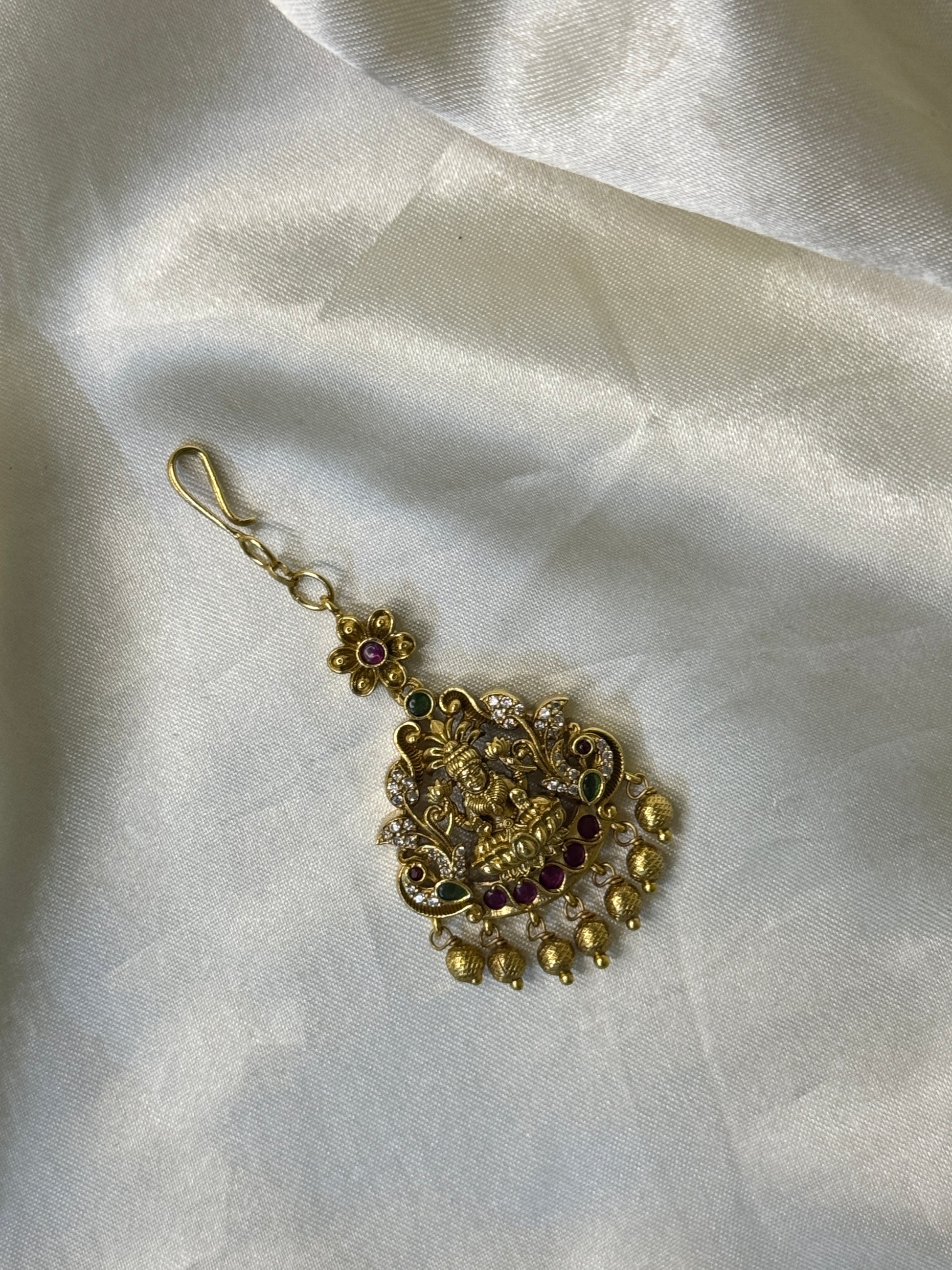 Experience divine elegance with this exquisite antique maangtikka, intricately designed with a majestic Lakshmi motif, graceful peacock accents, and delicate floral detailing. Enhanced with radiant golden beads, this masterpiece reflects heritage craftsmanship and timeless beauty. A perfect accessory for bridal, festive, and temple jewelry collections, it adds a regal touch to any traditional ensemble. Pair it with complementing jewelry for a truly royal look.