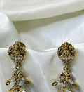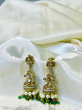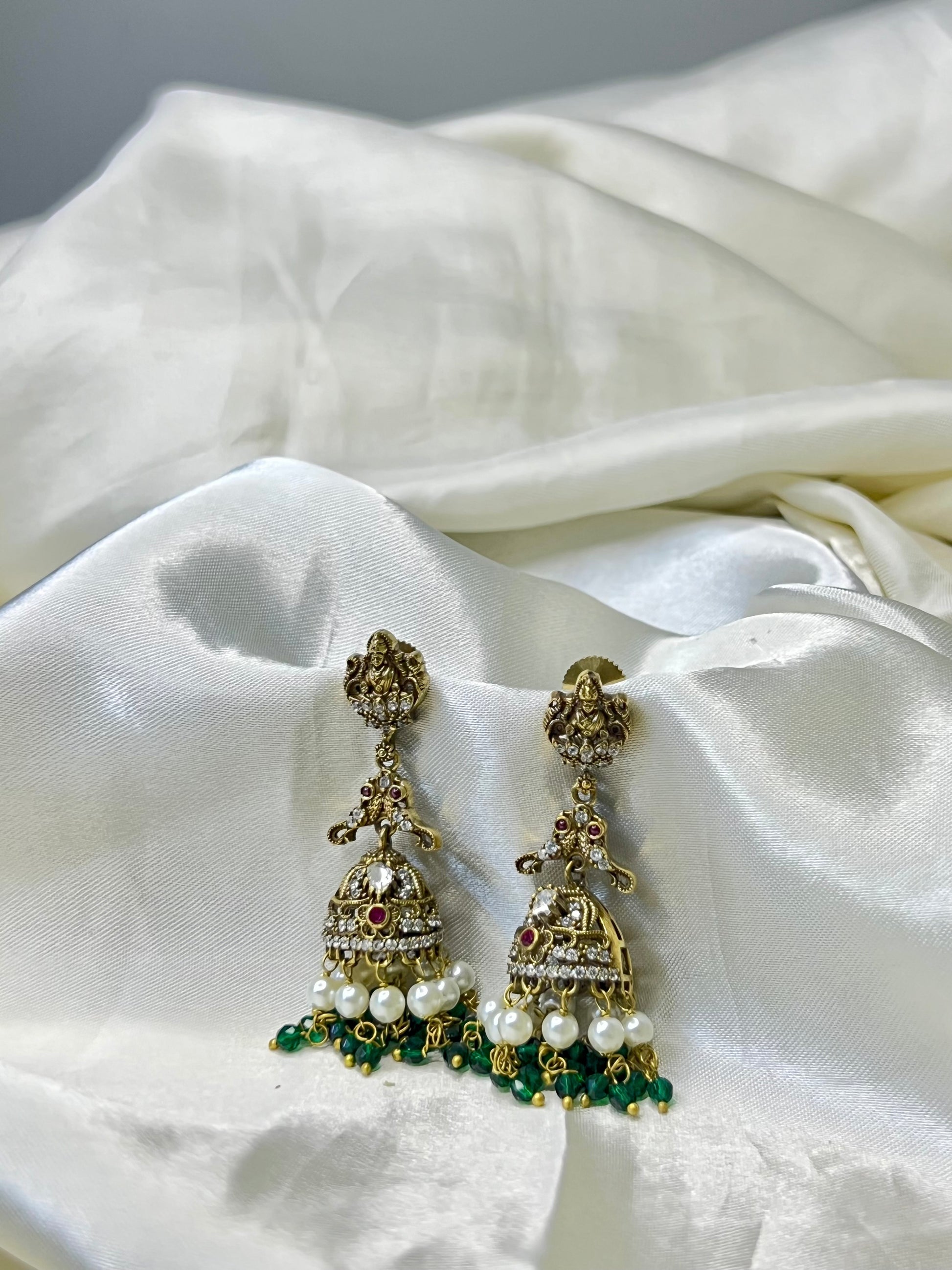 Adorn yourself with these exquisite Lakshmi-themed jhumkas, crafted with intricate stone detailing and elegant green bead accents. A perfect blend of tradition and timeless charm, these earrings exude heritage elegance, making them an ideal choice for weddings and festive occasions. A statement piece that reflects cultural grace and sophistication