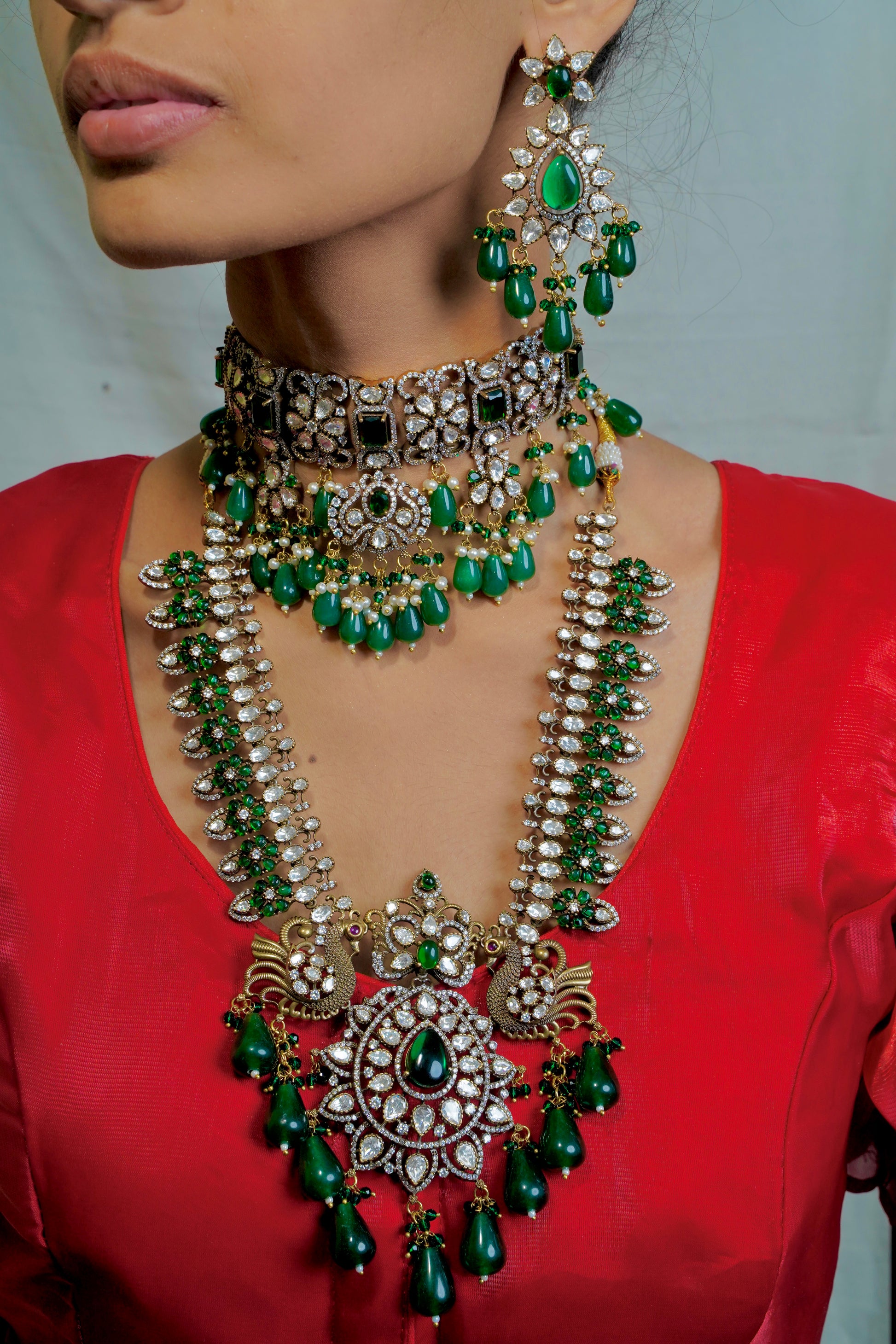 Victorian Emerald Royale β Choker & Long Necklace Combo with Peacock & Crystal Floral Design