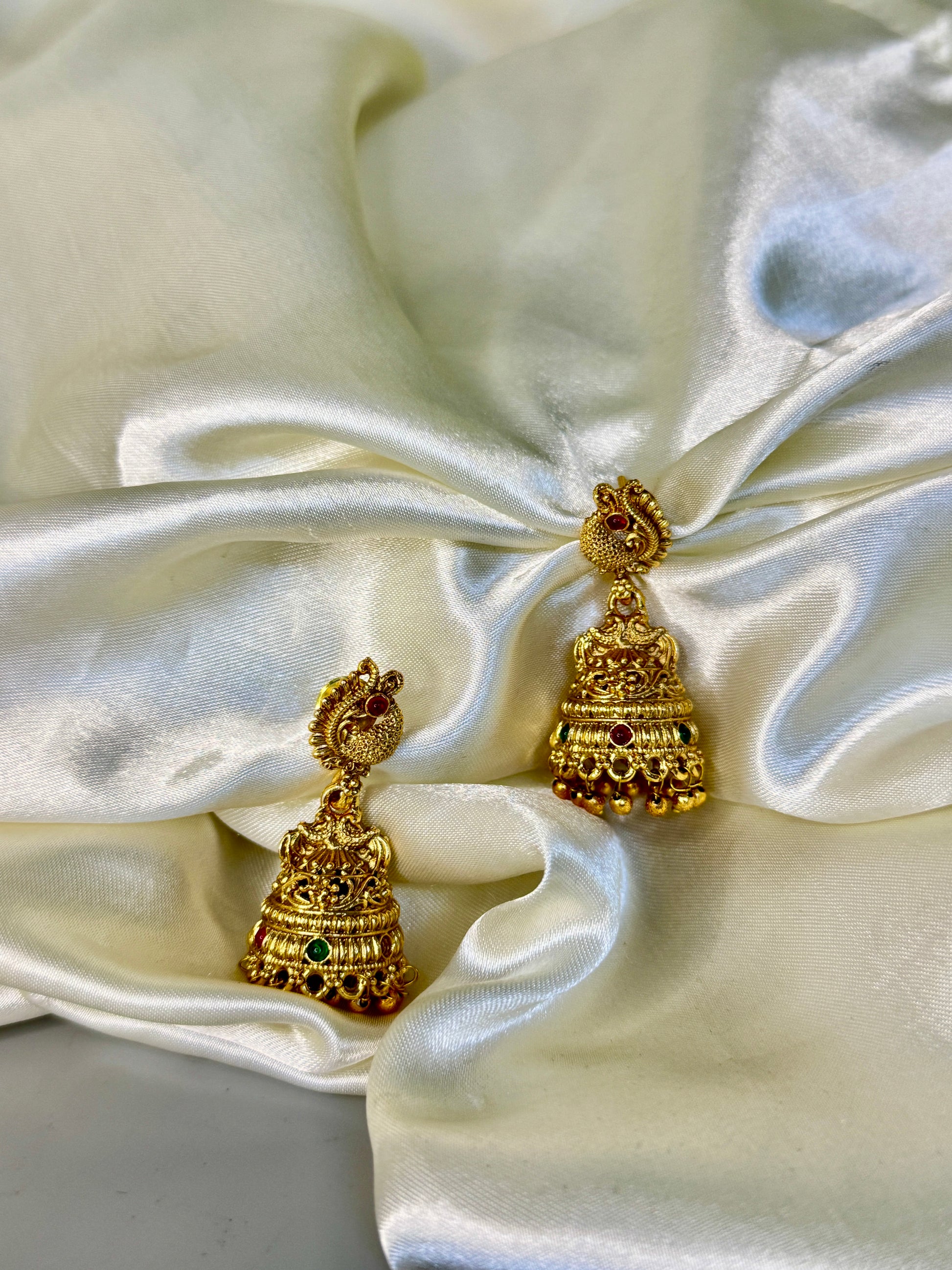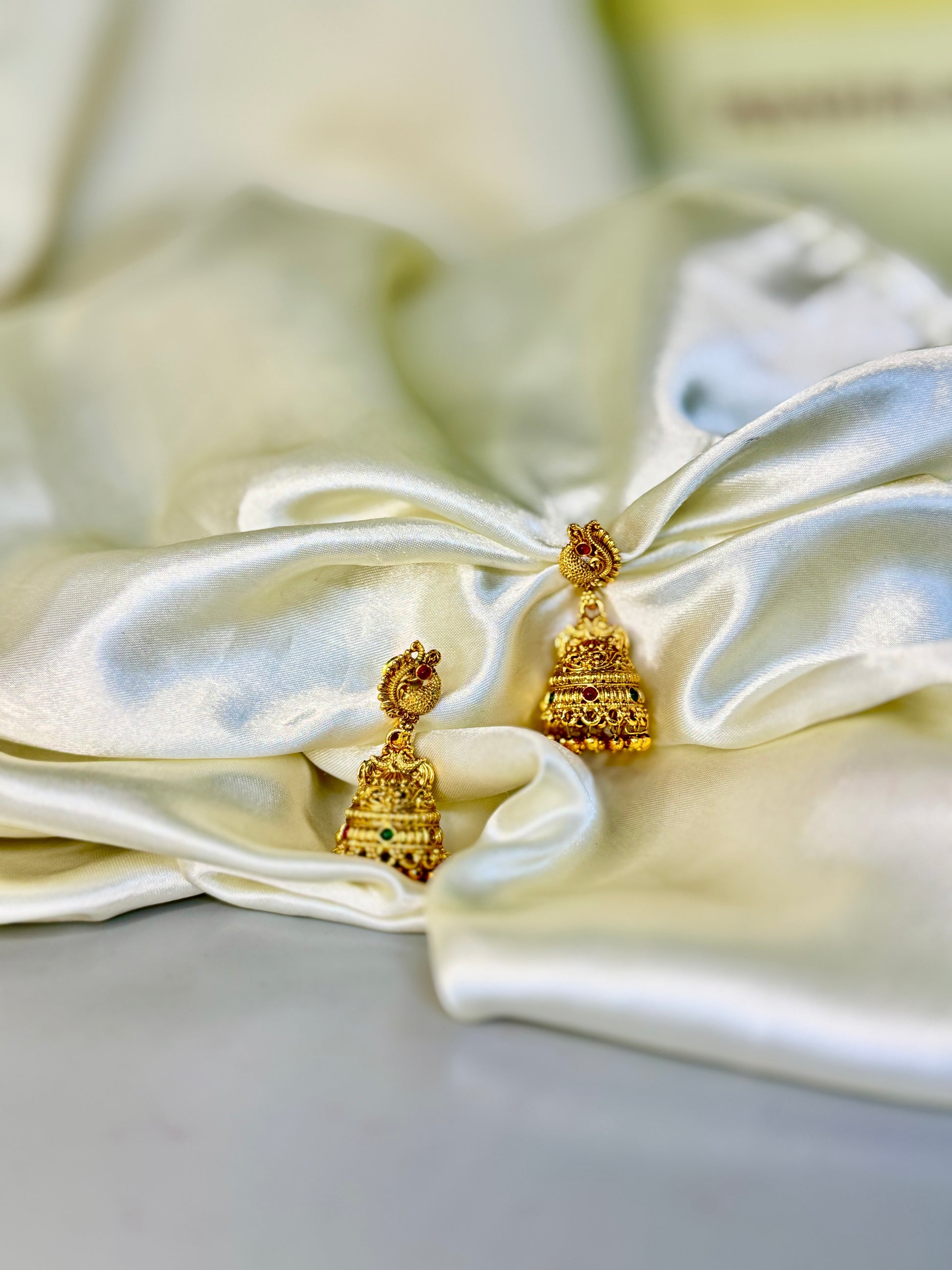 Add a touch of heritage charm with these exquisite antique-style earrings, inspired by the majestic peacock. Intricately designed with fine detailing, these earrings showcase a graceful peacock motif, symbolizing beauty and elegance. Adorned with delicate golden beads, they bring a regal and traditional appeal, making them perfect for weddings, festive occasions, and cultural celebrations.