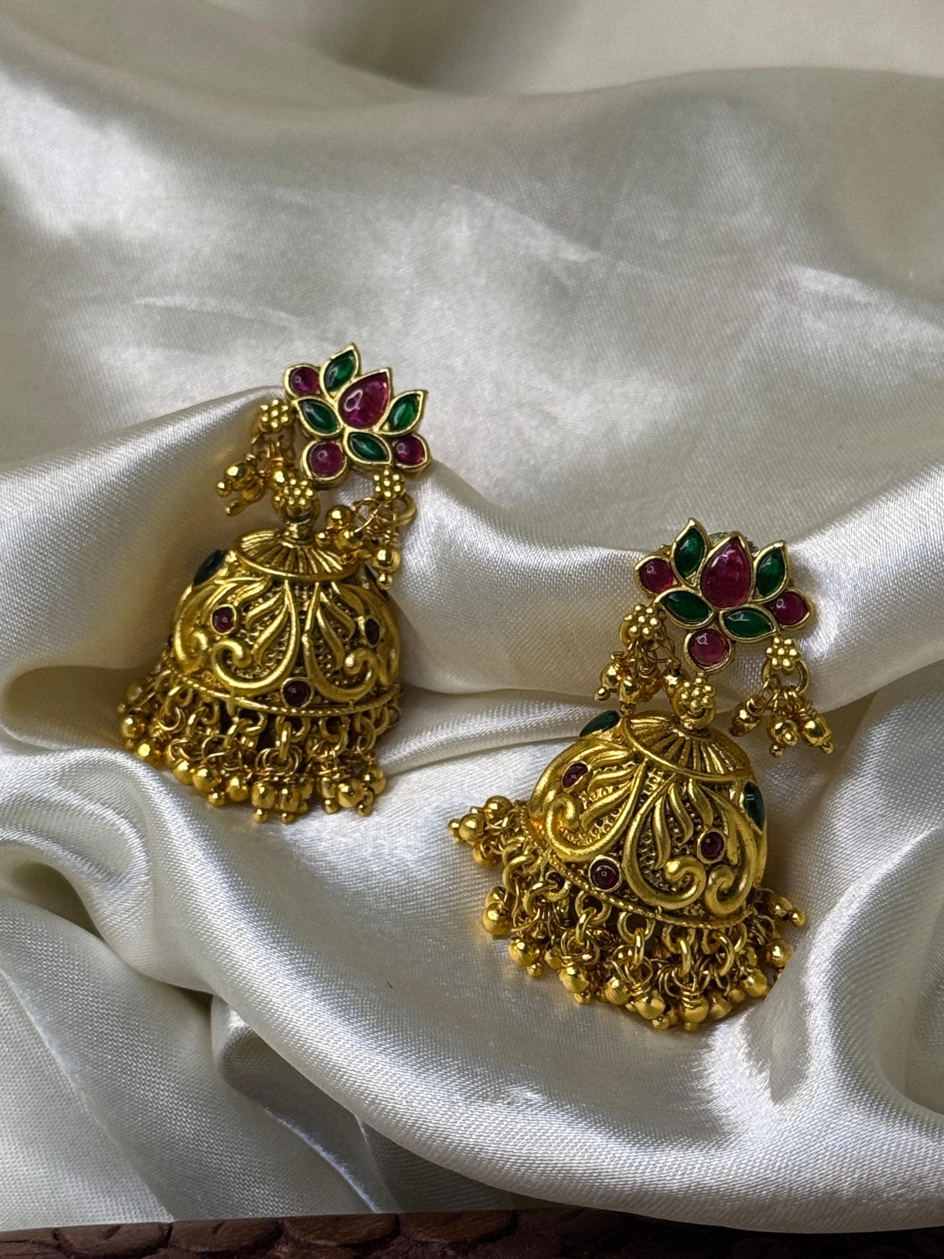 Regal Antique Lotus Jhumka Earrings with Golden Bead Accents