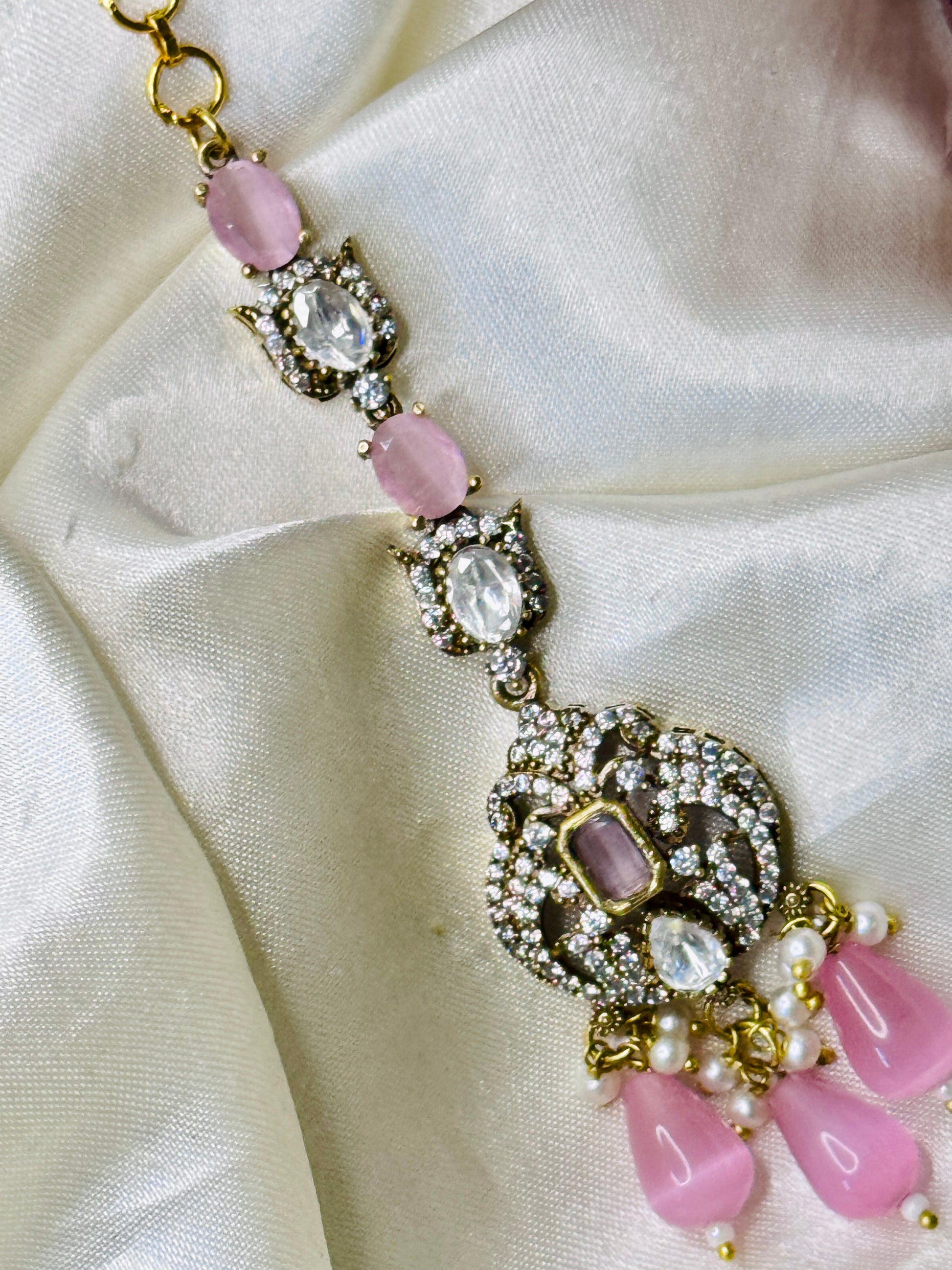 Elevate your traditional look with this exquisite maangtikka, adorned with radiant pink stones and delicate white beads. Designed for grace and charm, this piece adds a touch of elegance to weddings, festive occasions, and special celebrations. Perfect for pairing with ethnic ensembles, it enhances your beauty with its timeless appeal.