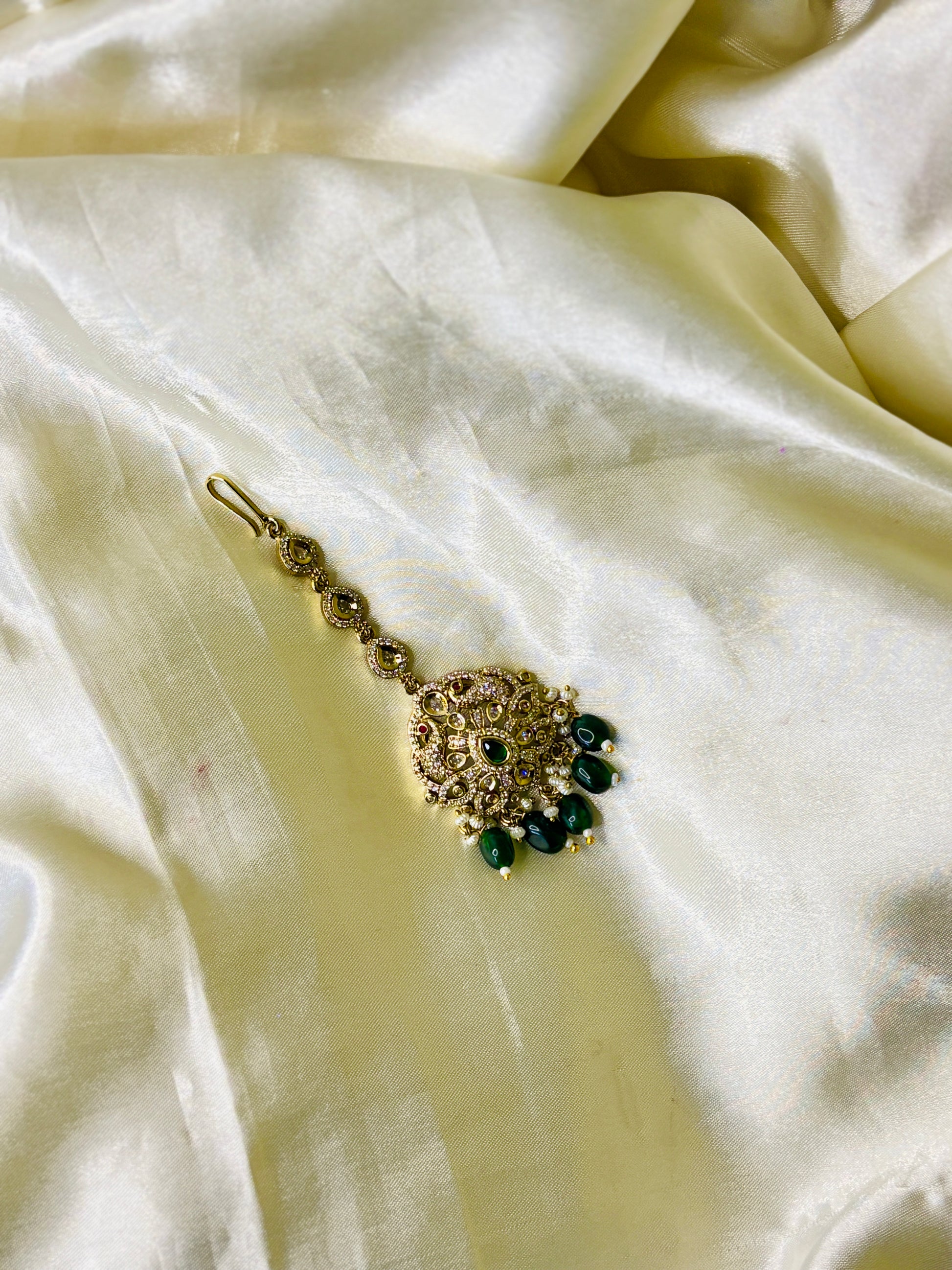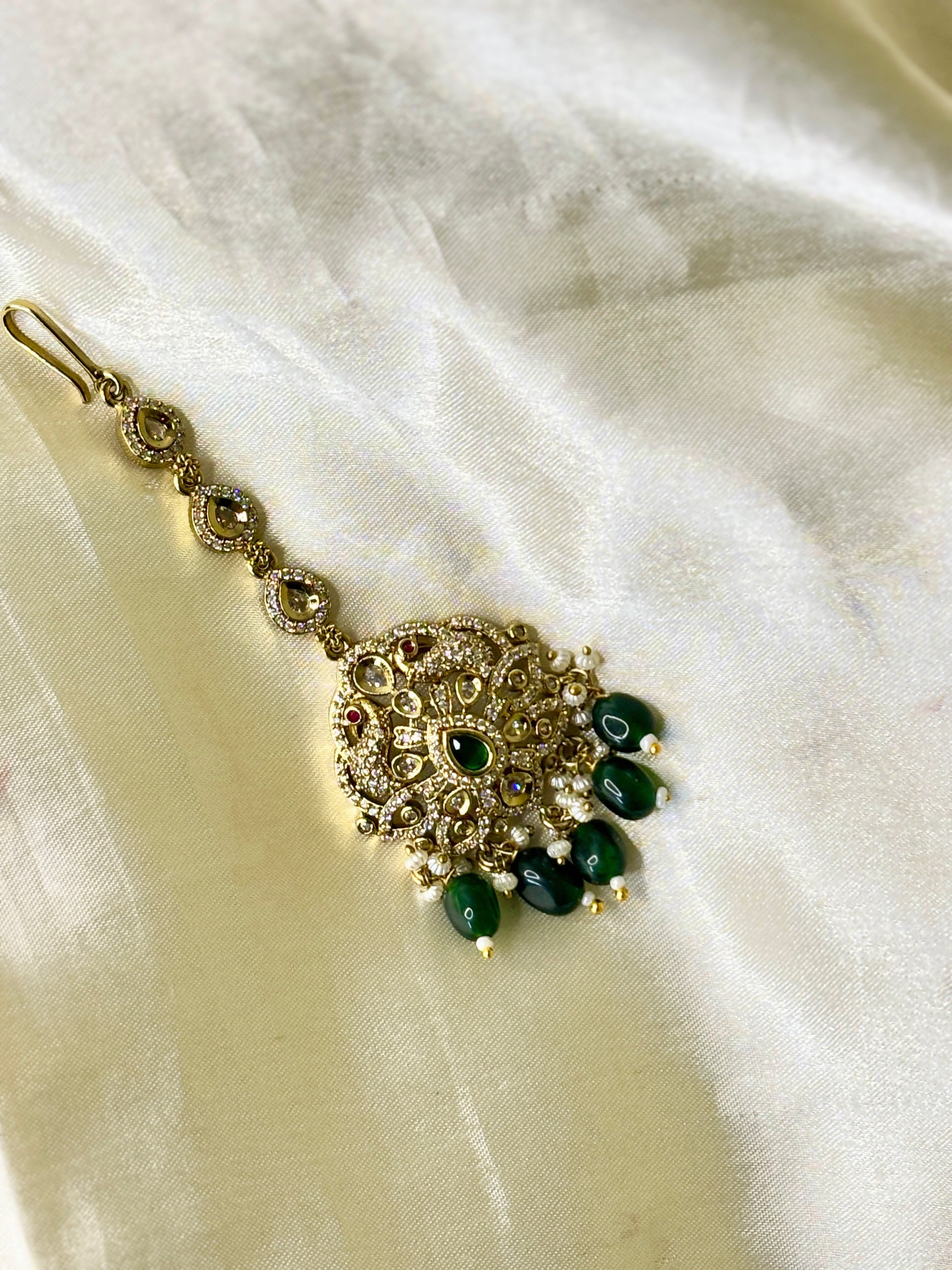 Graceful Peacock Maangtikka with Crystal Accents & Green Bead Droplets