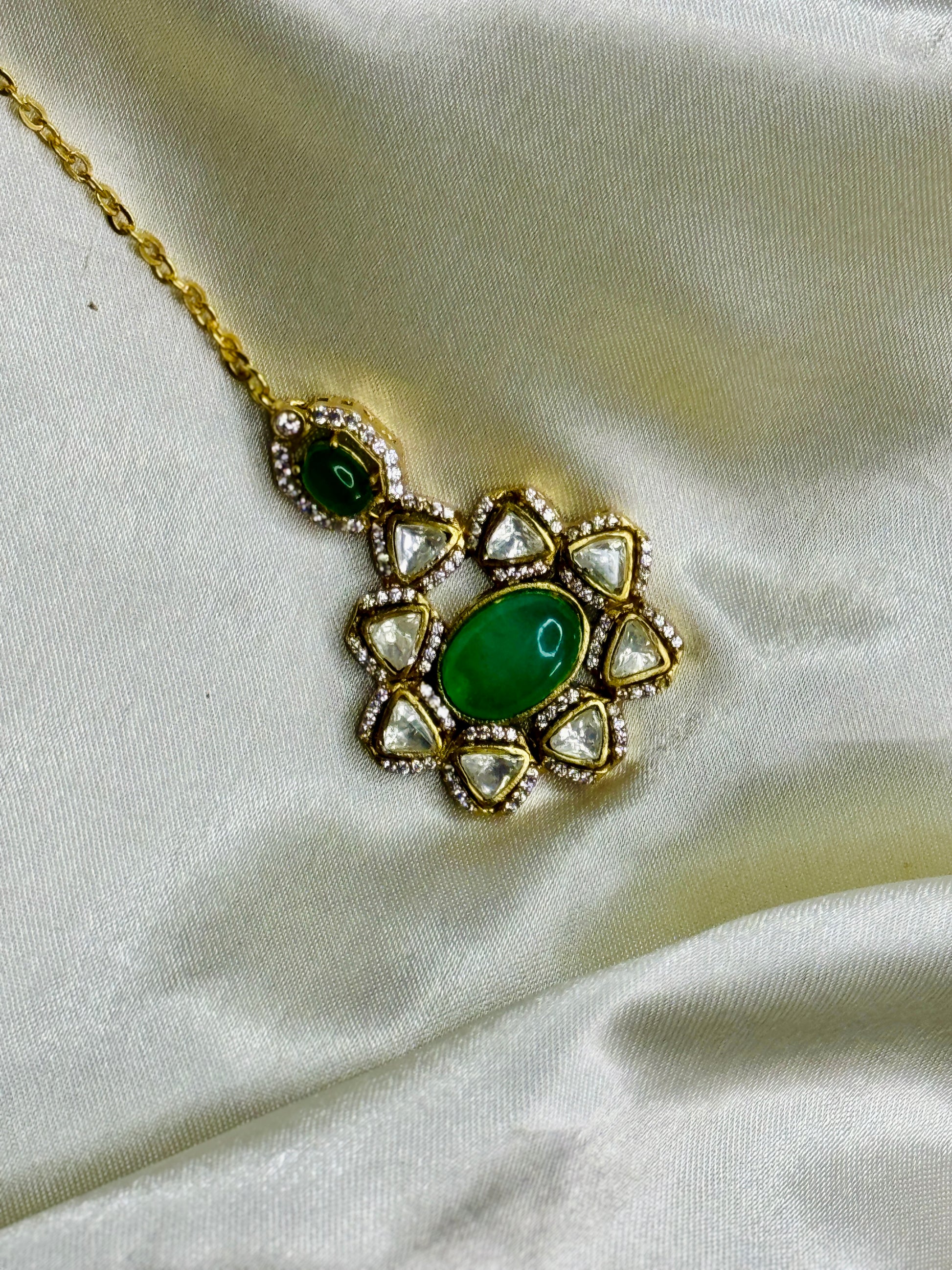 Embrace delicate elegance with this Pastel Green Charm Victorian mangtikka, featuring a soft pastel green stone as its stunning centerpiece. Surrounded by intricate crystal stone detailing and a flawless crystal finish, this piece combines vintage-inspired beauty with modern sophistication. Ideal for weddings, cultural occasions, or special celebrations, this mangtikka adds a refined touch to any ensemble. Let this exquisite accessory elevate your style with its graceful allure and timeless charm.
