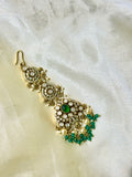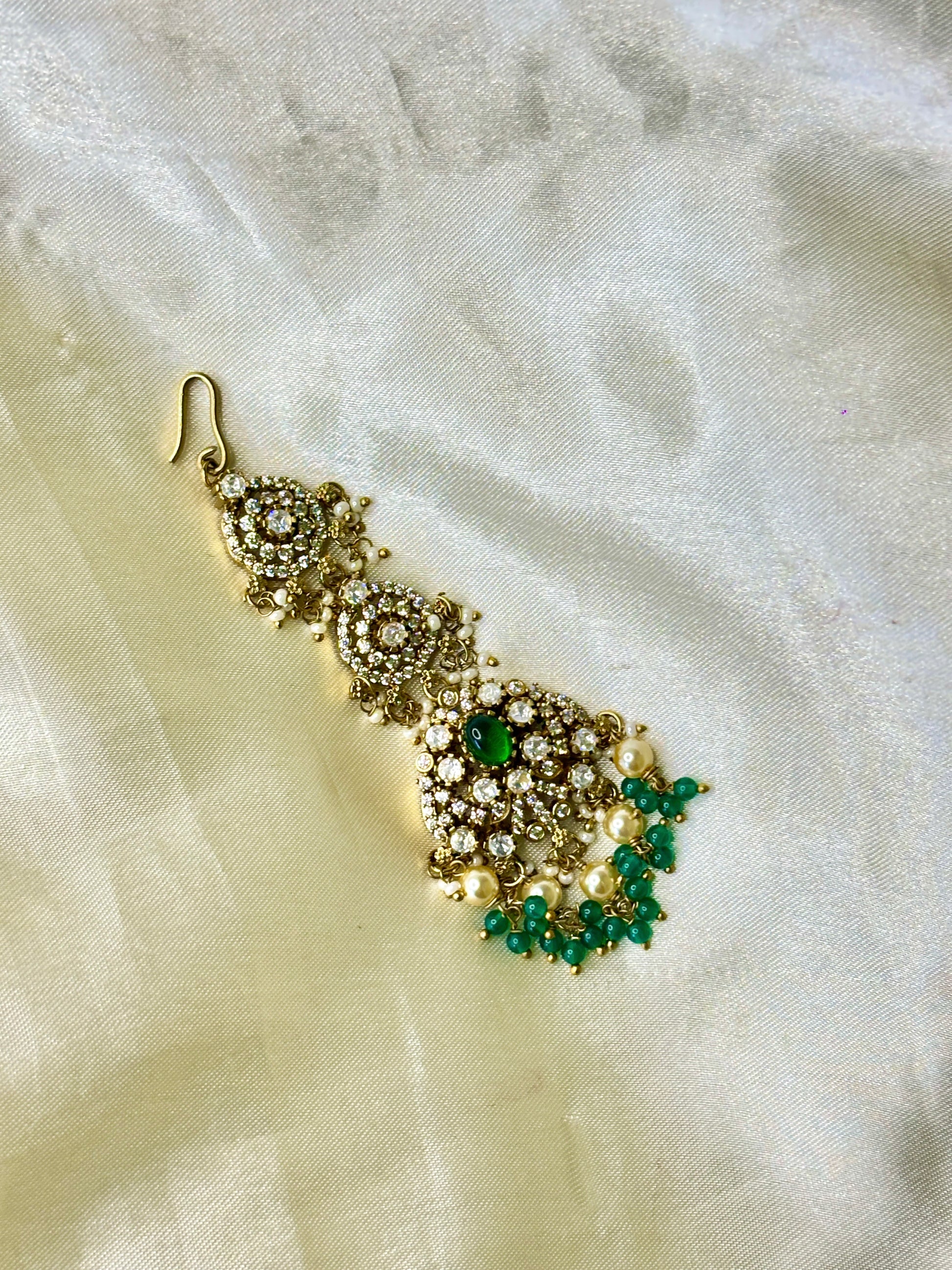 Adorn yourself with the elegance of this Victorian-inspired maangtikka, featuring intricate floral detailing and a radiant crystal finish. Delicately embellished with green beads, this piece exudes a timeless charm, perfect for weddings, festive occasions, and traditional celebrations. A statement accessory that beautifully blends vintage allure with modern grace.