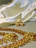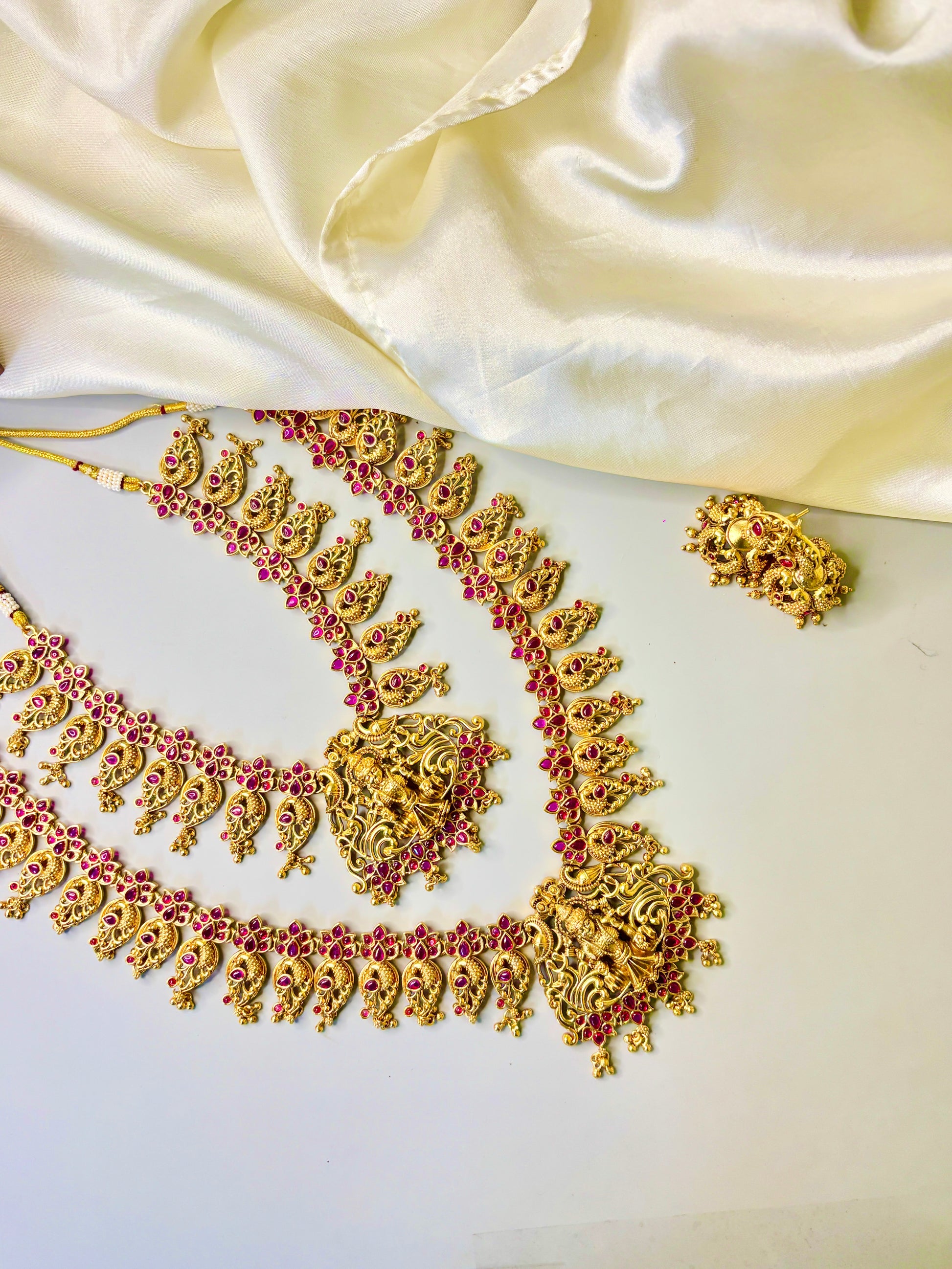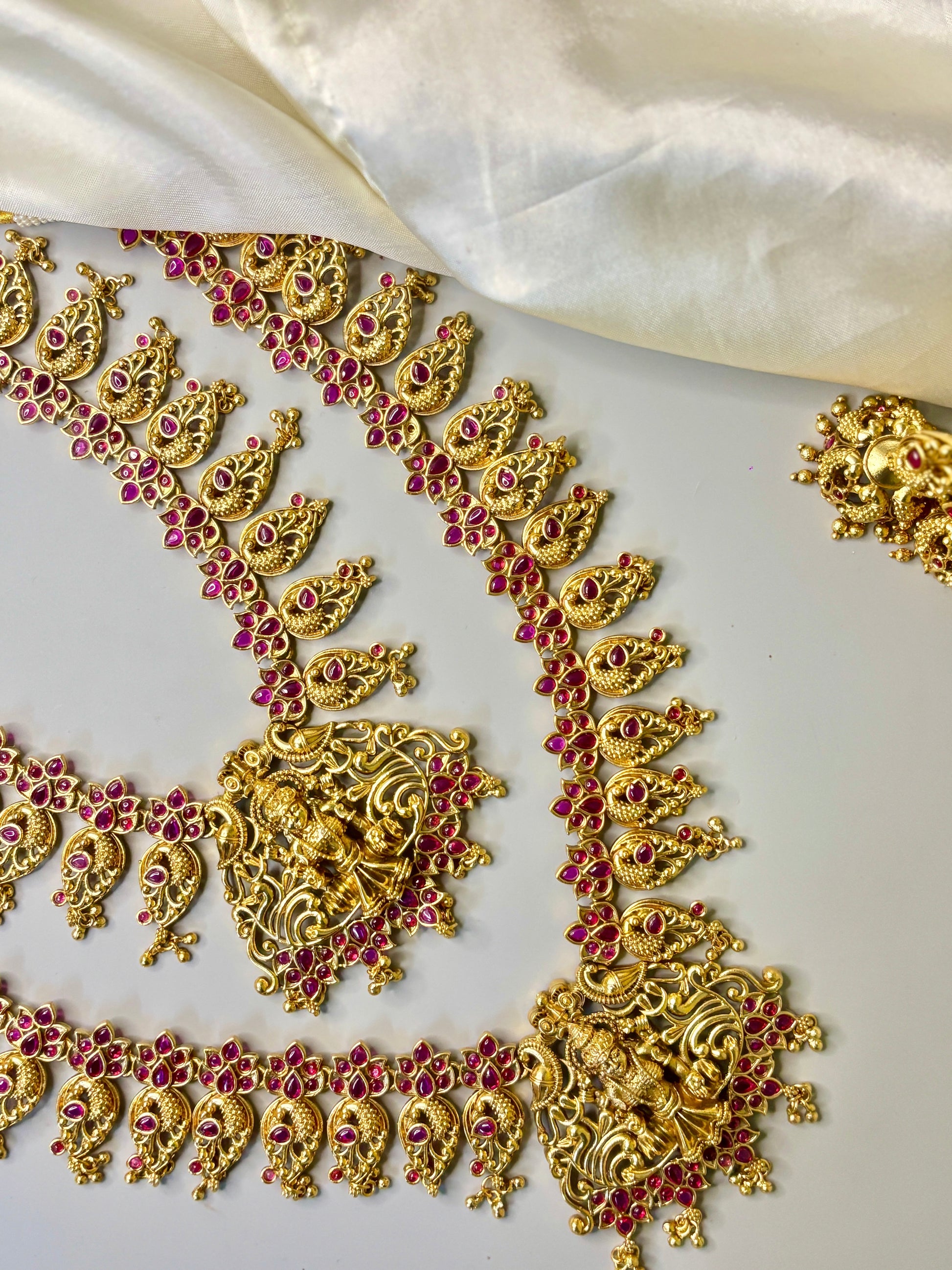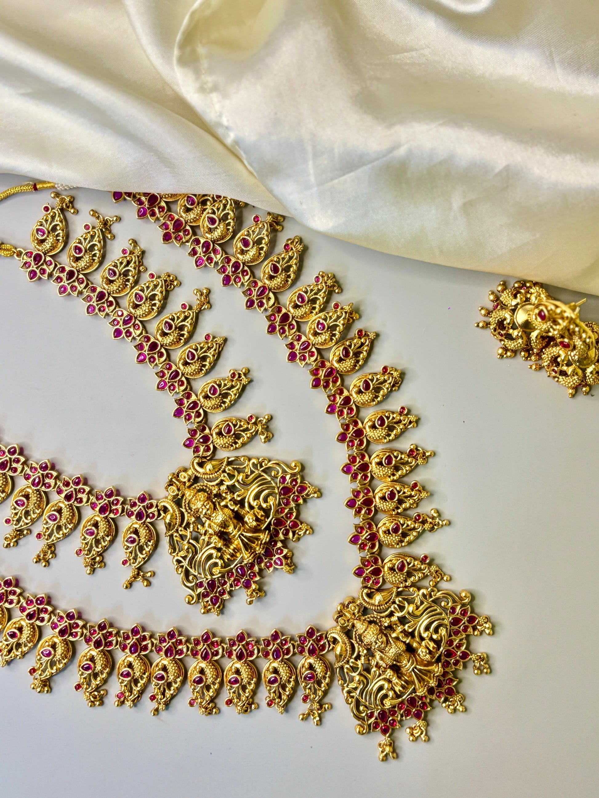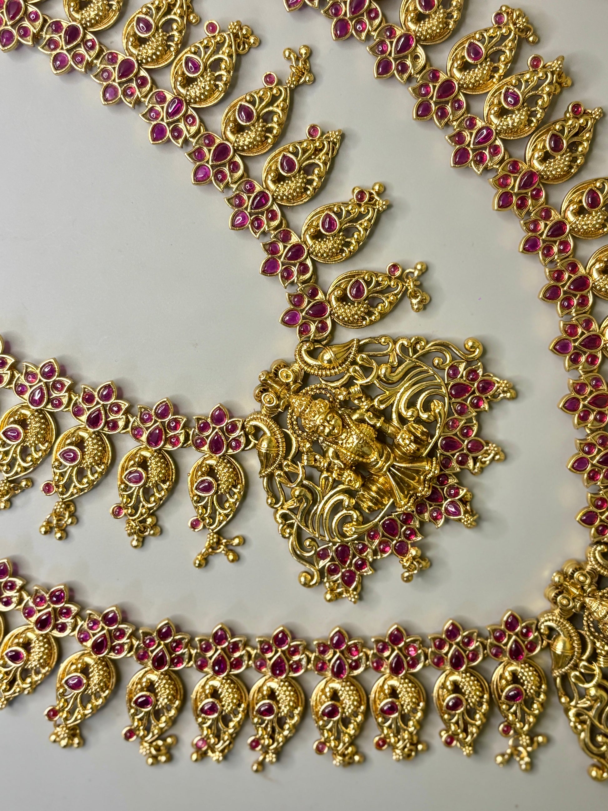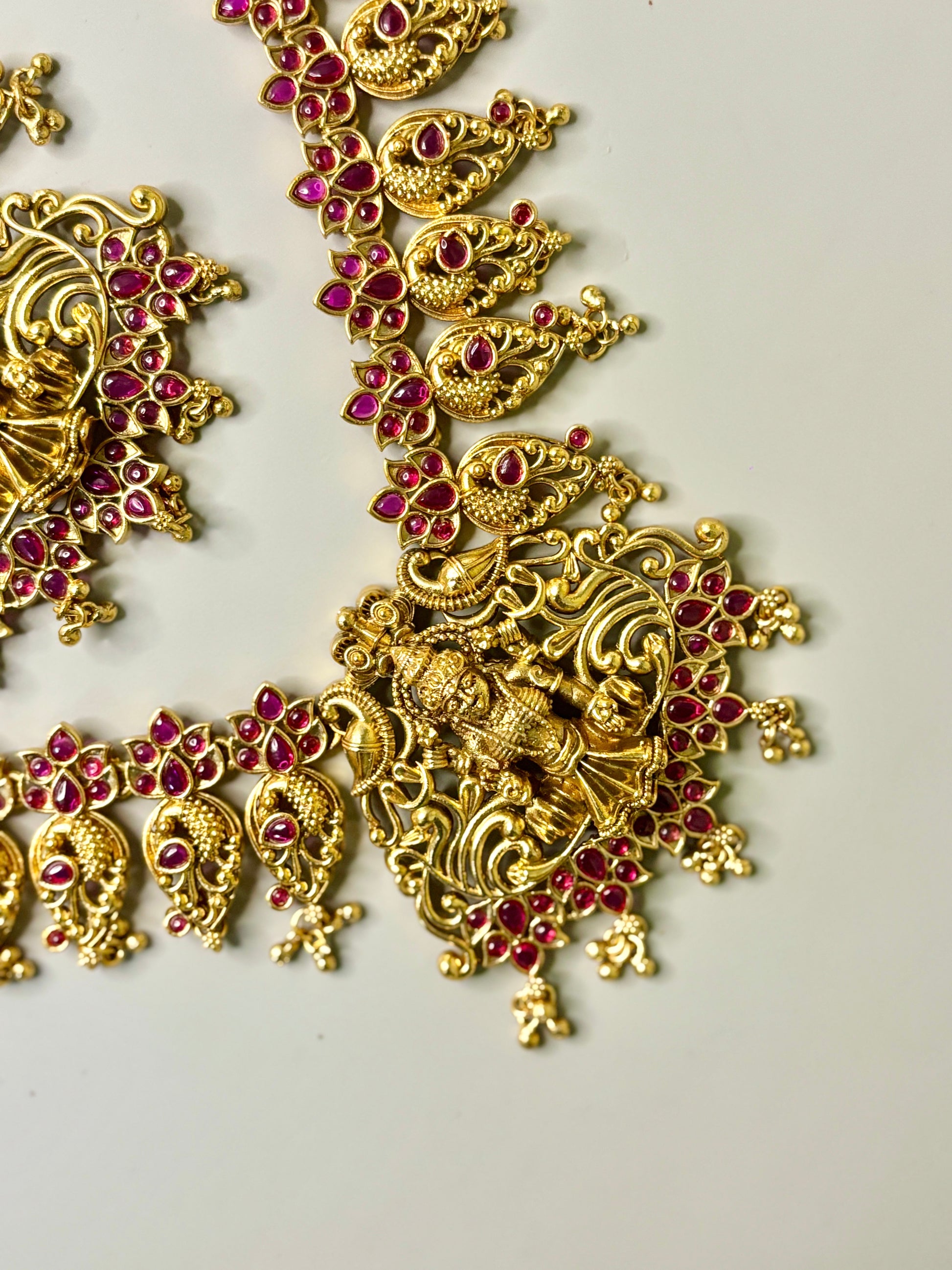 A masterpiece of tradition and artistry, this antique necklace features exquisite peacock and Lakshmi detailing, symbolizing grace and prosperity. Adorned with radiant pink stones and accented with elegant golden beads, this design exudes regal charm. Perfect for weddings and festive occasions, this timeless piece adds a touch of heritage grandeur to your jewelry collection.