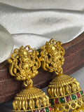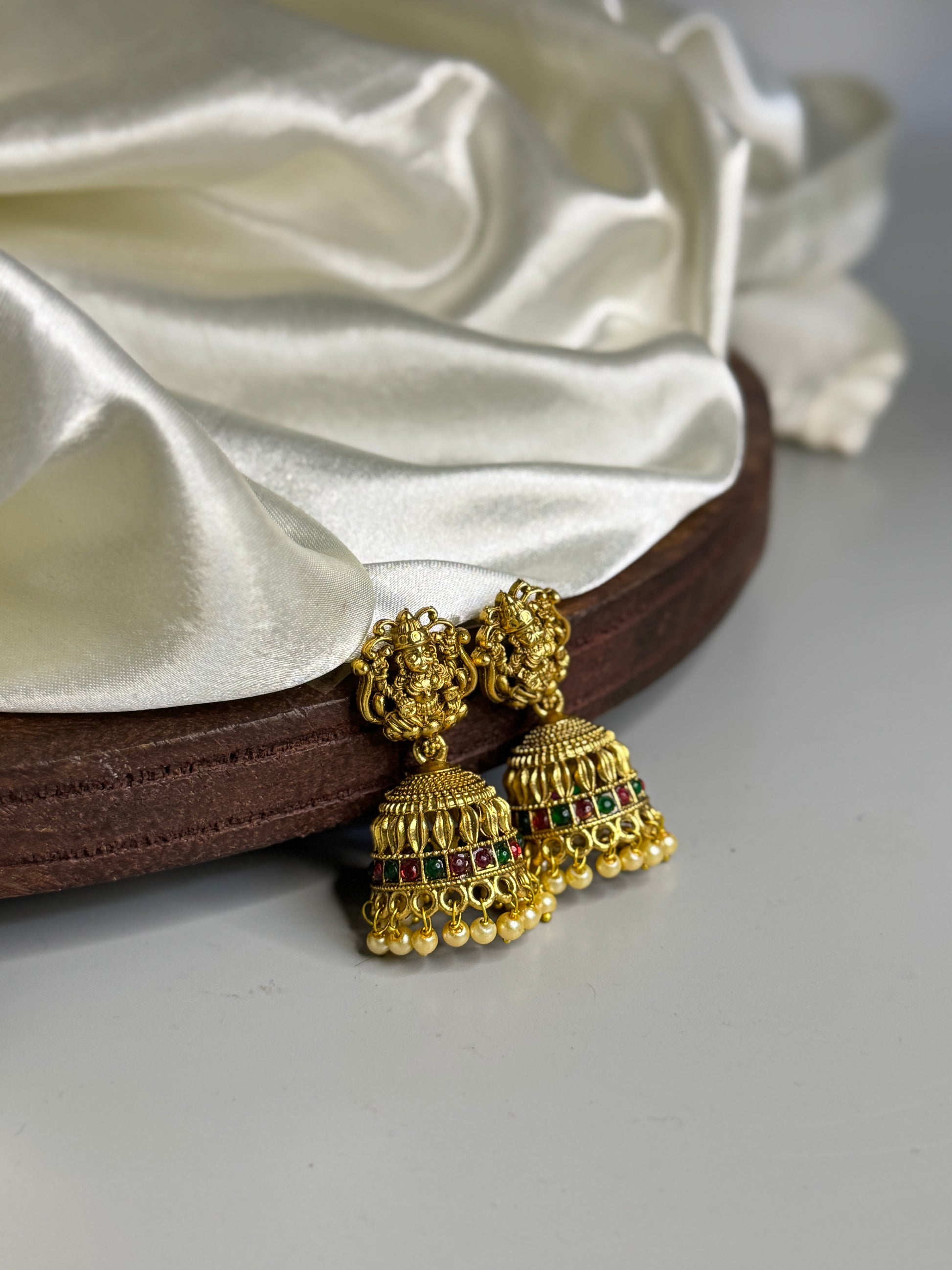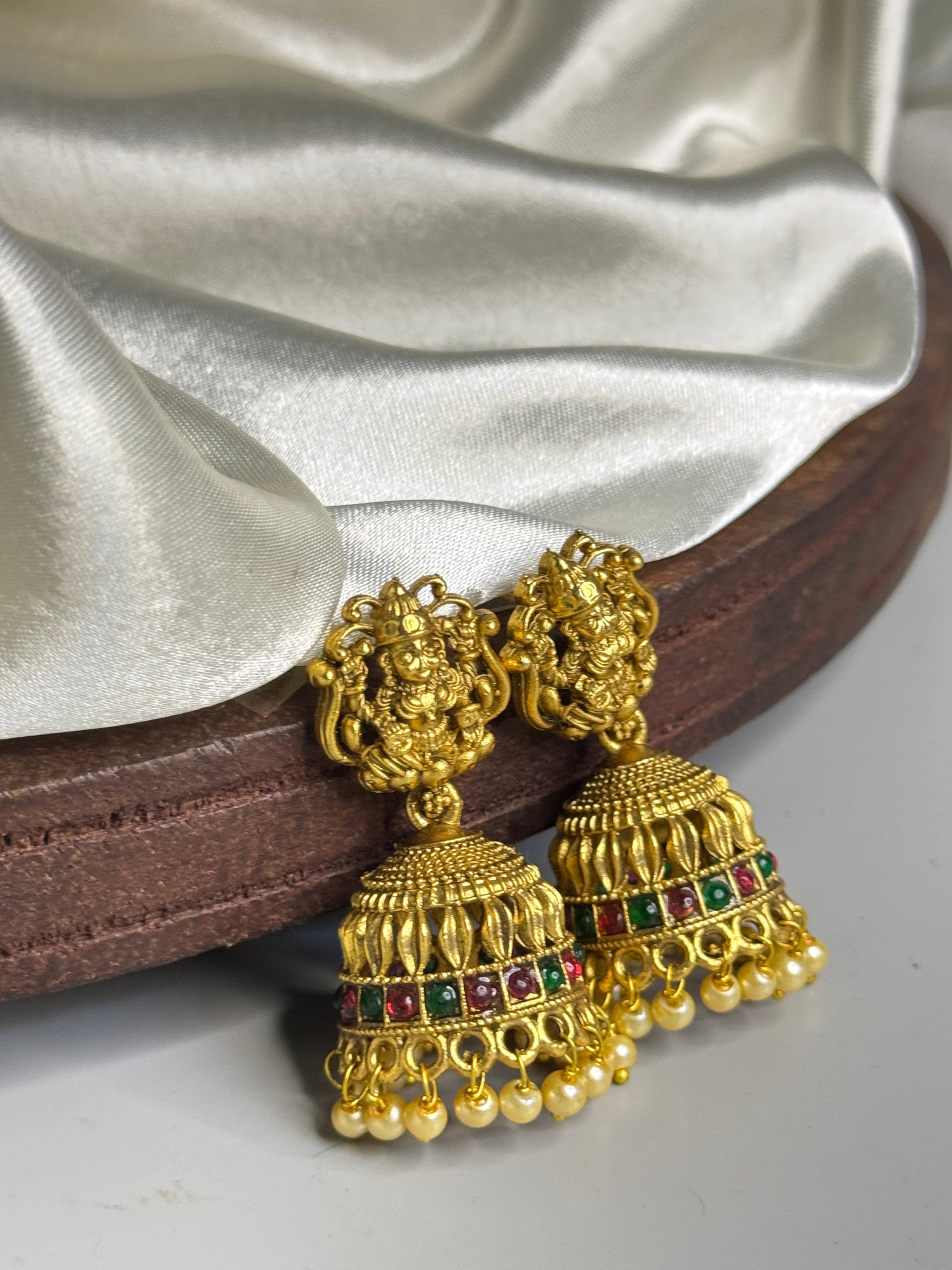 Embrace the charm of tradition with these antique earrings, beautifully detailed with the revered image of Goddess Lakshmi and accented with luxurious golden beads. A perfect fusion of spirituality and style, these earrings bring a sense of prosperity and elegance to any occasion. Crafted with intricate artistry, they are ideal for festivals, weddings, or as a statement piece in your everyday collection.