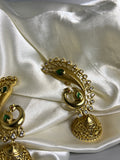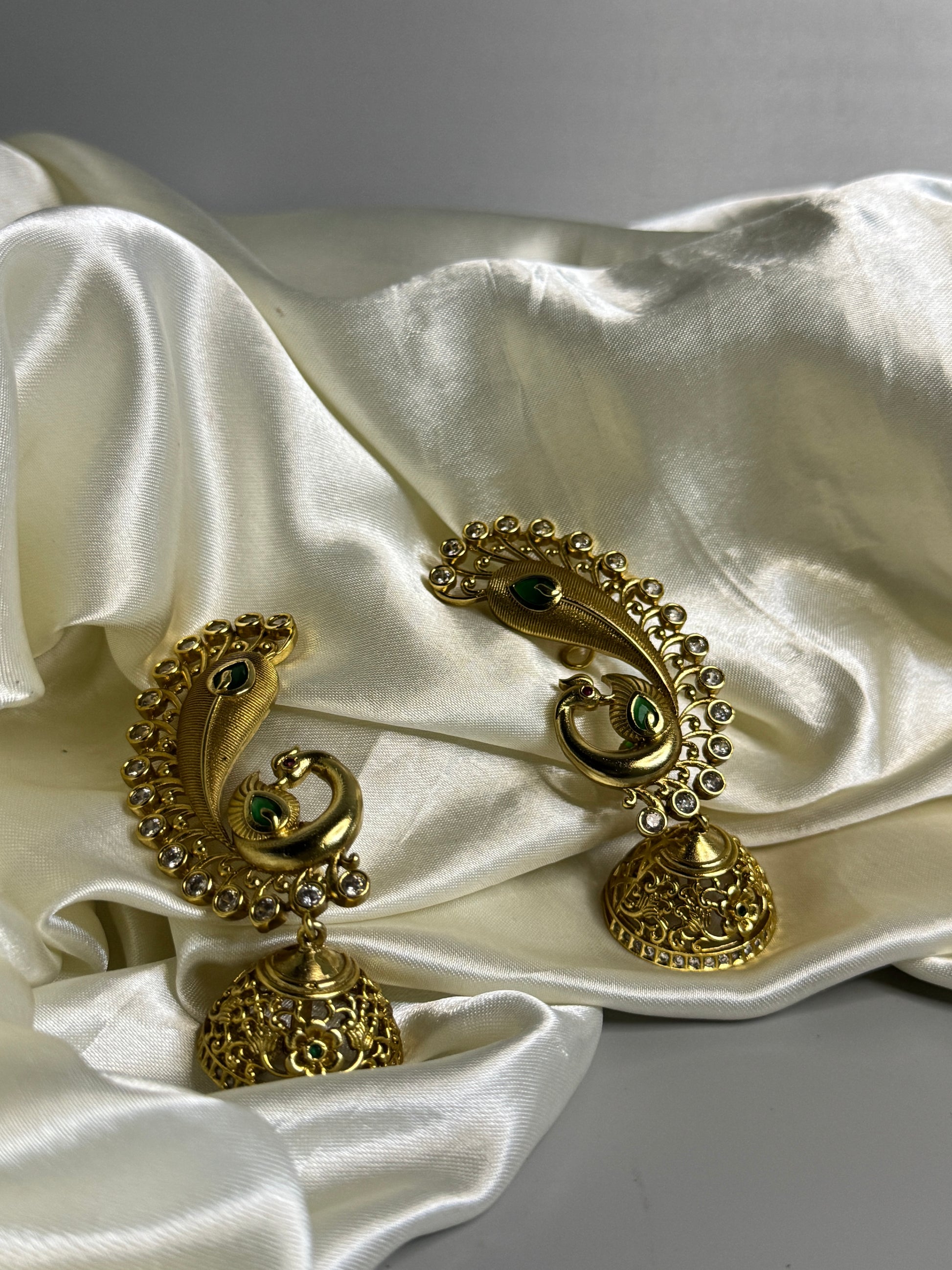 These regal earrings feature a full peacock design, showcasing the beauty and grandeur of this magnificent bird. Intricate detailing highlights the graceful curves and feathers, creating a stunning visual effect. The design is both elegant and bold, making it a perfect statement piece for any occasion. Whether for a festive celebration or a special evening, these earrings add a touch of sophistication and cultural charm to your ensemble. Crafted with precision and care, they are a timeless addition to any jewelry collection.