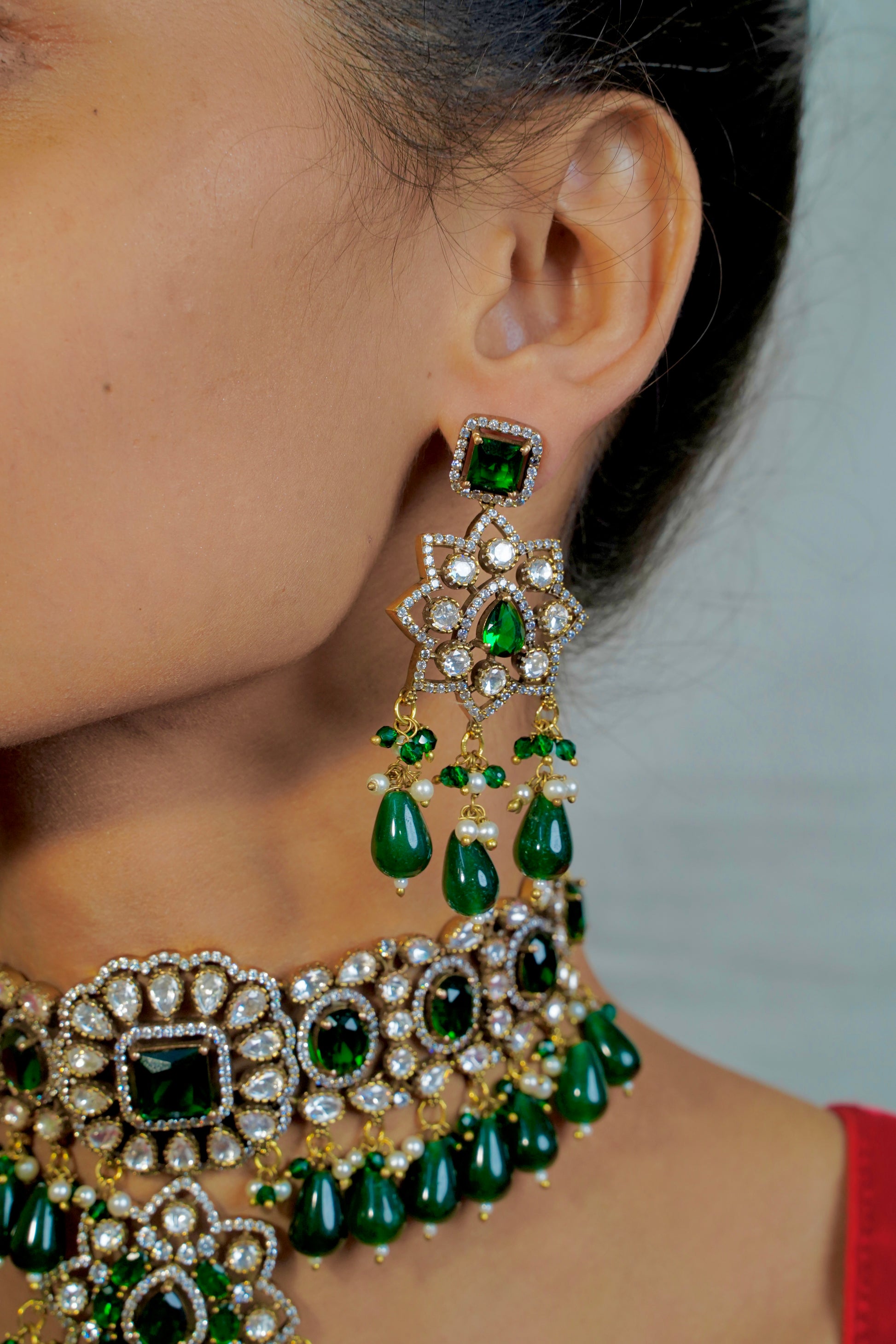 Step into elegance with this Victorian-inspired choker set, featuring a stunning array of American diamonds (AD), intricate floral motifs, and rich green stone accents. The choker is beautifully complemented with green and pearl bead drops, adding a graceful and royal charm. Paired with matching earrings, this set exudes a vintage allure, perfect for weddings, festive occasions, or any event where you want to make a statement. Embrace the blend of Victorian artistry with a modern touch, making this set a true showstopper in any jewelry collection.