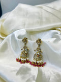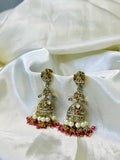 Elevate your traditional look with these exquisite Lakshmi-themed jhumkas, featuring intricate stone detailing and rich red bead accents. Designed with a timeless appeal, these earrings blend heritage craftsmanship with elegance, making them a perfect choice for weddings and festive celebrations. A statement piece that embodies grace and tradition.
