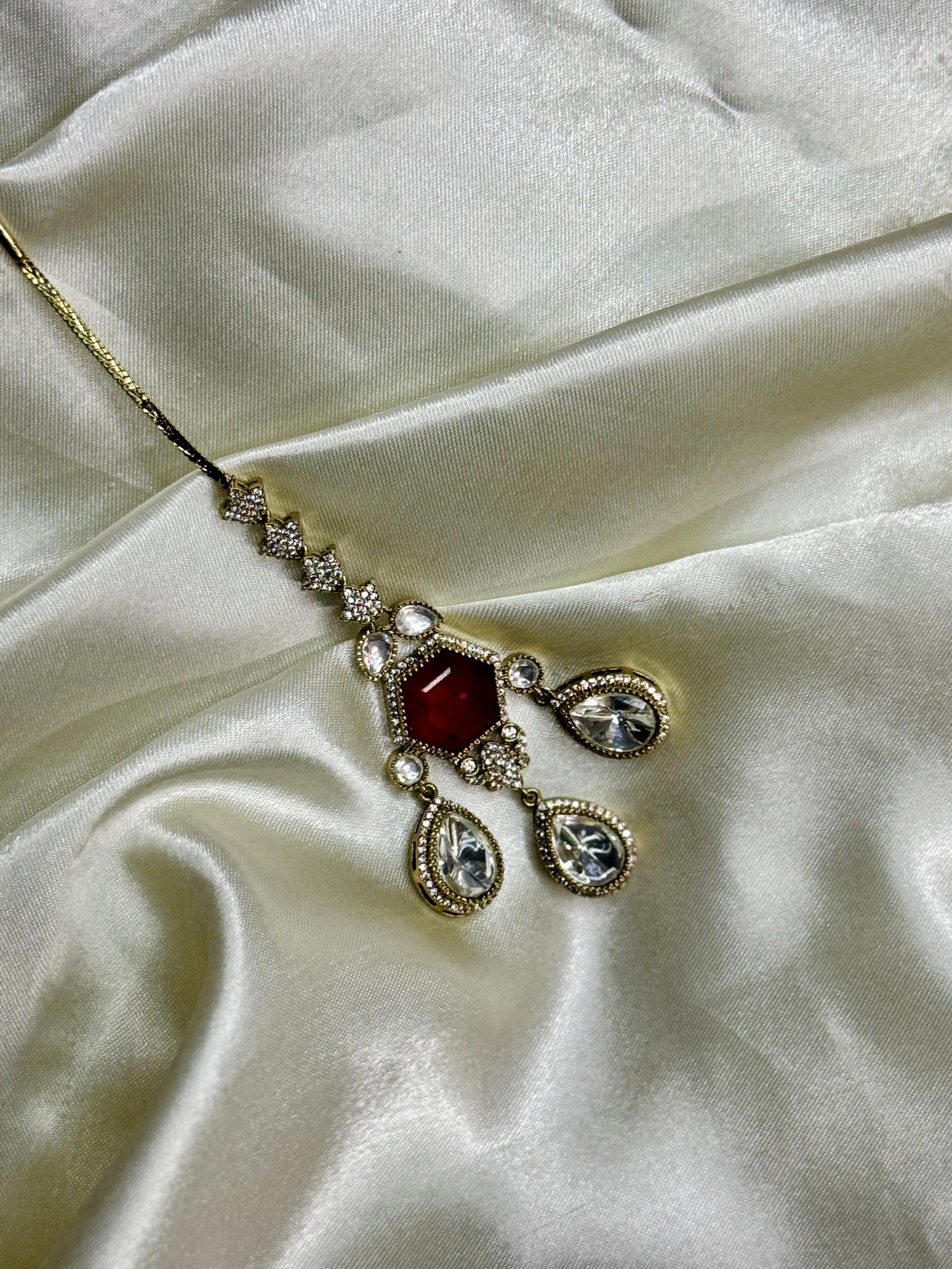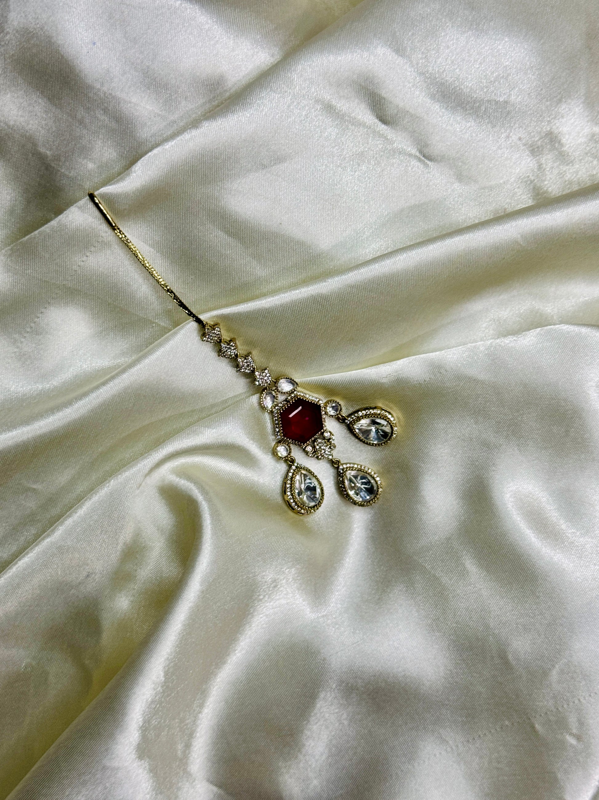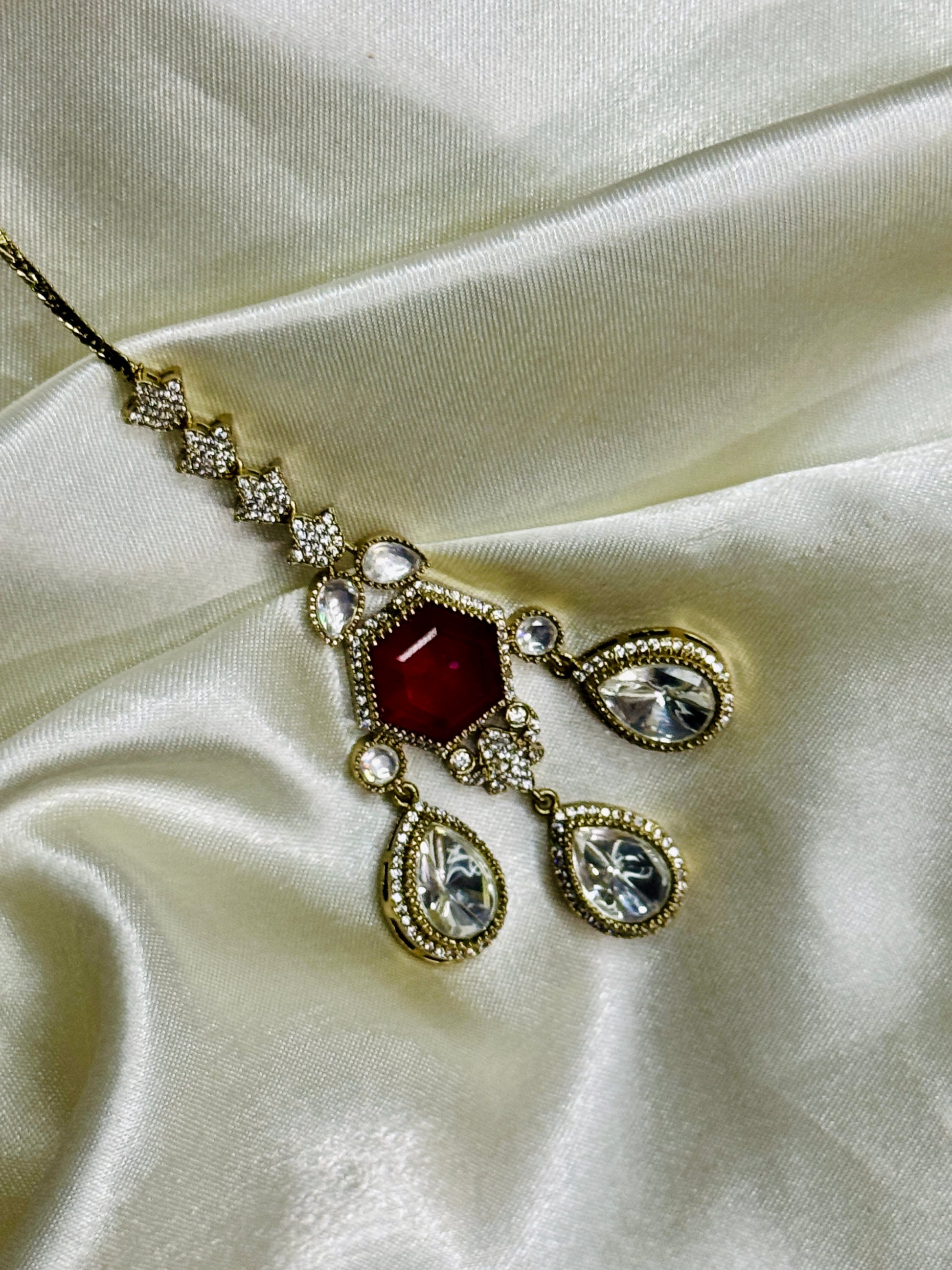 Step into timeless sophistication with this Crimson Elegance Victorian mangtikka, featuring a captivating red stone as its centerpiece. Surrounding it, glimmering crystal beads and intricate detailing create a harmonious blend of vintage charm and modern allure. Ideal for weddings, festive occasions, or special celebrations, this statement piece adds a regal touch to your attire. Designed to exude grace and refinement, this mangtikka is the perfect choice to elevate your traditional or fusion ensemble.