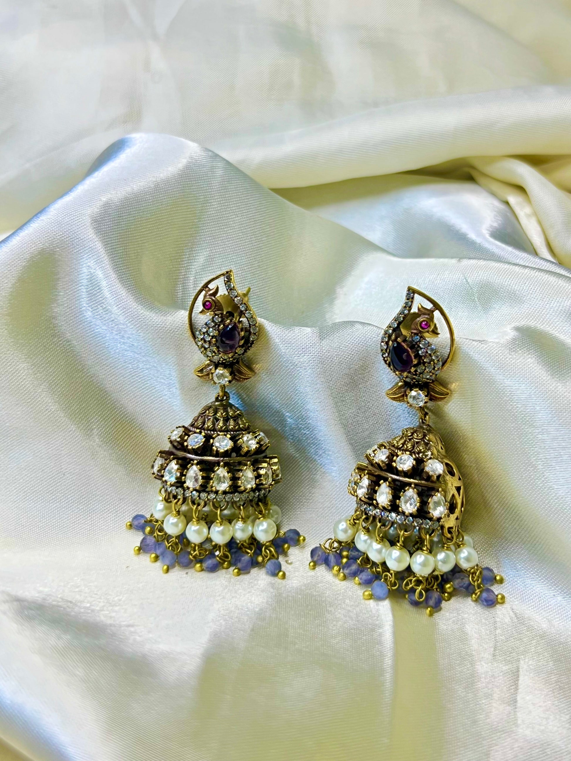 Victorian Peacock Earrings with purple Beads & Stones