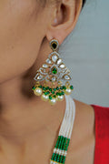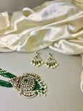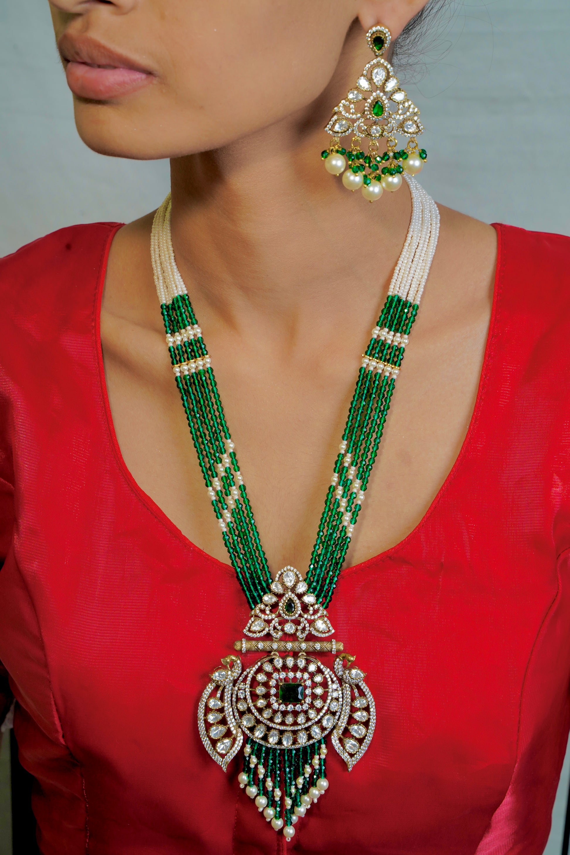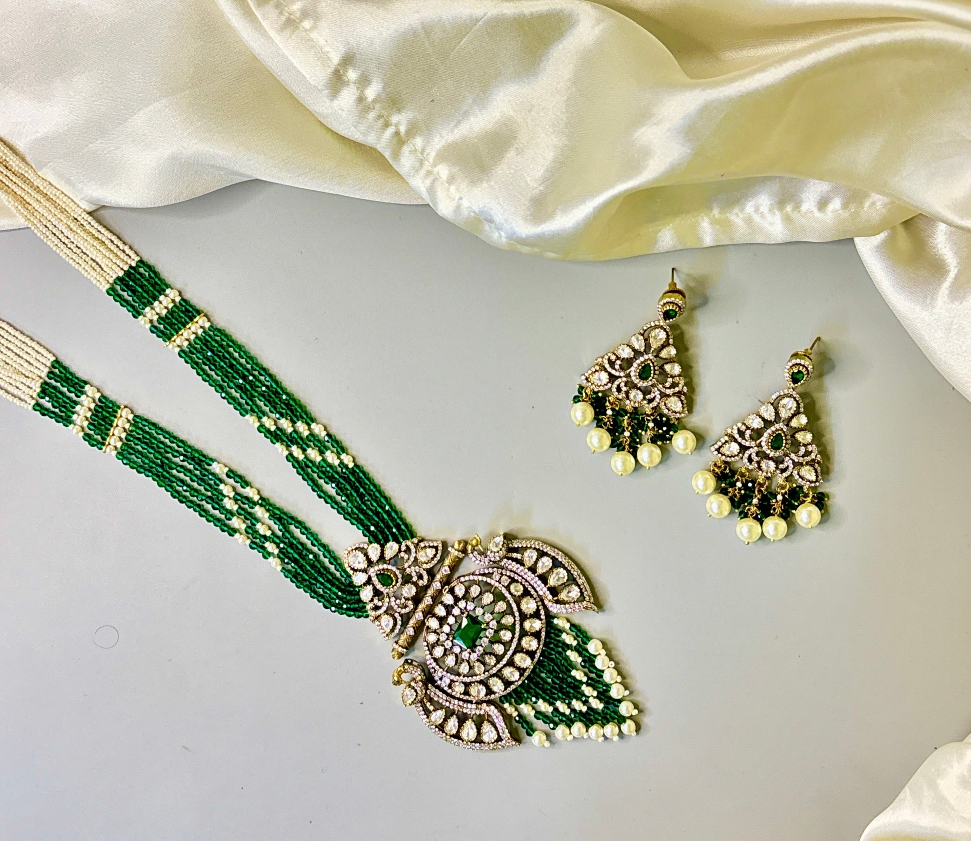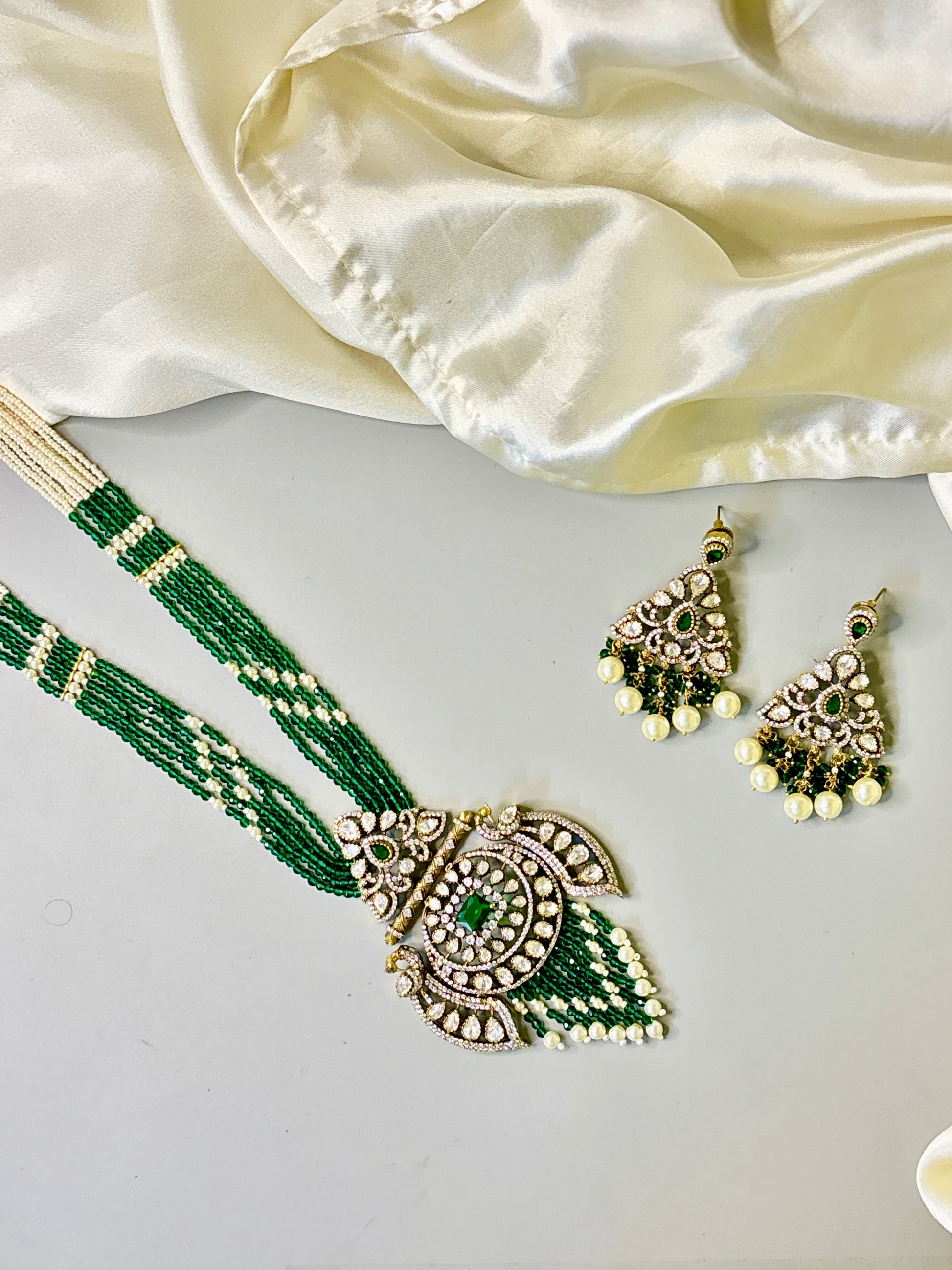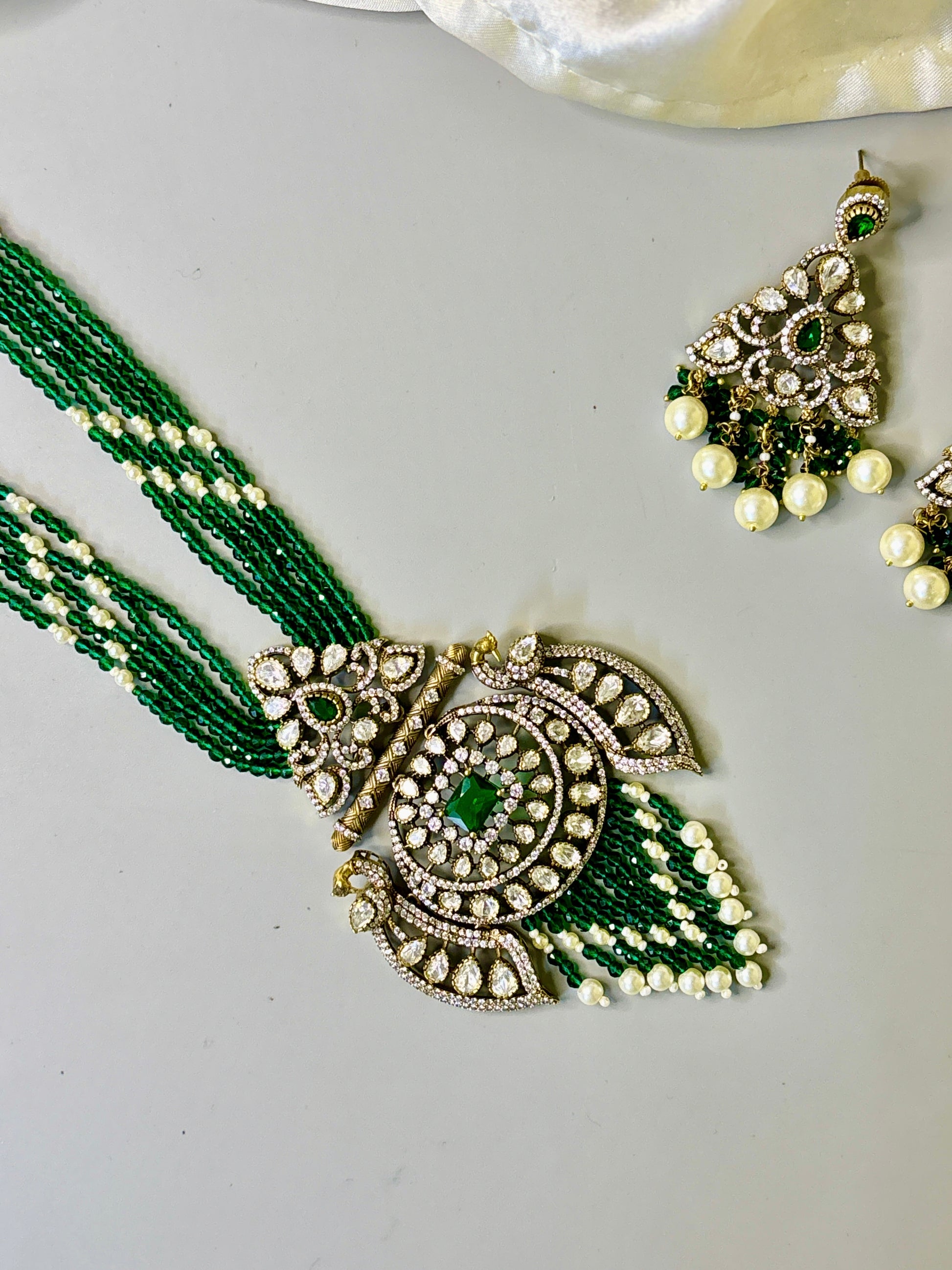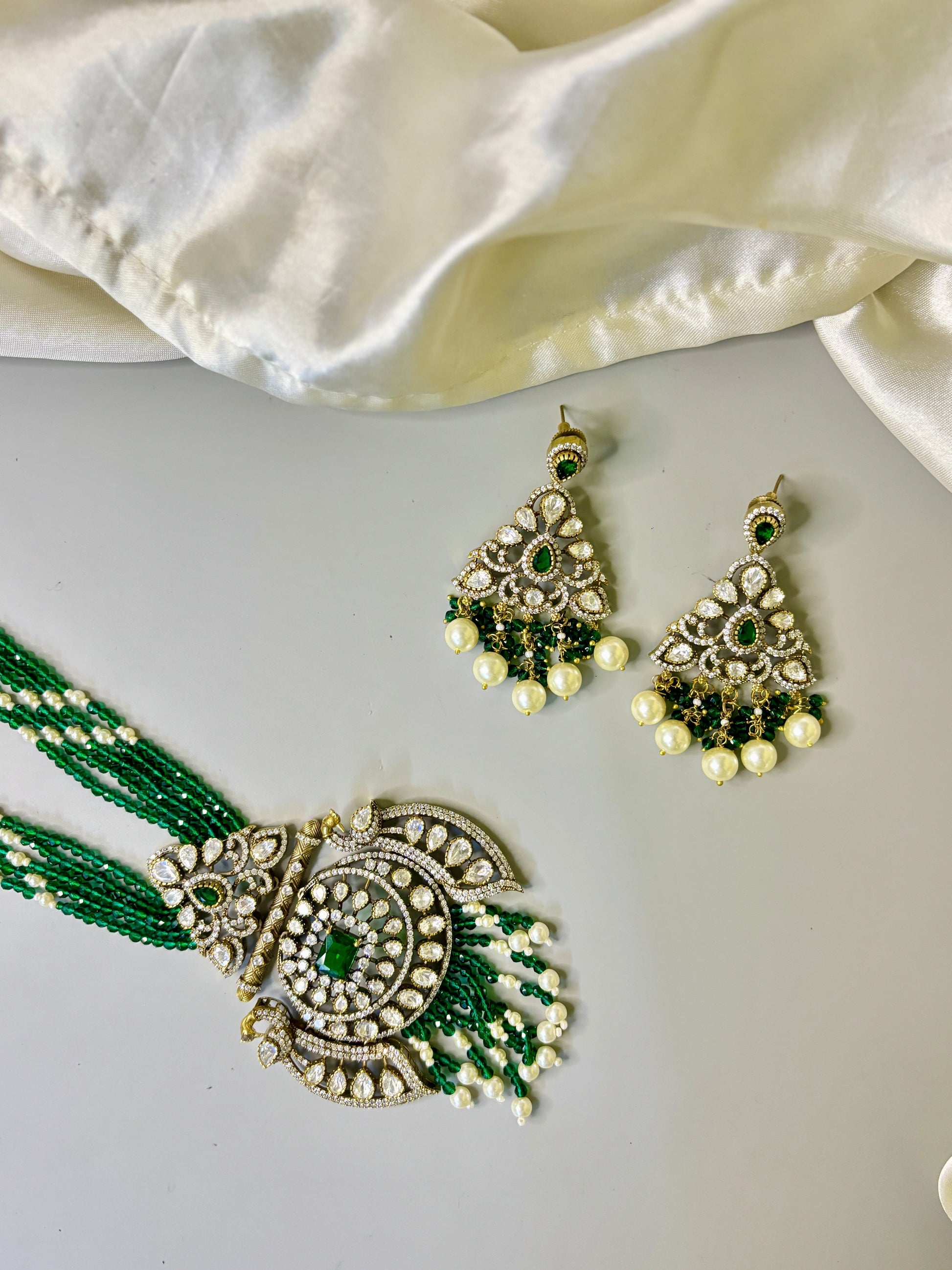 Victorian Green Beaded Peacock Necklace with Crystal Accents