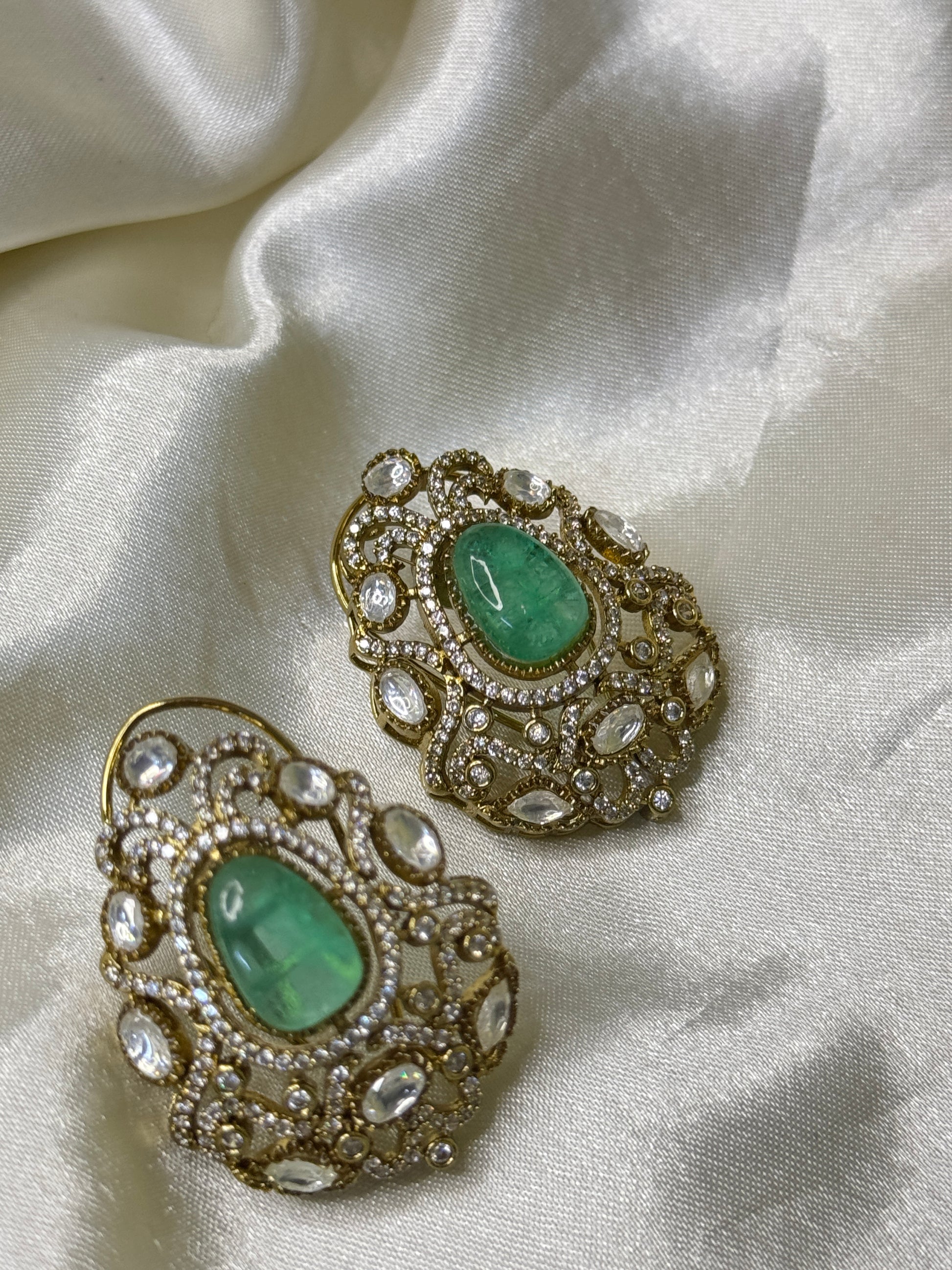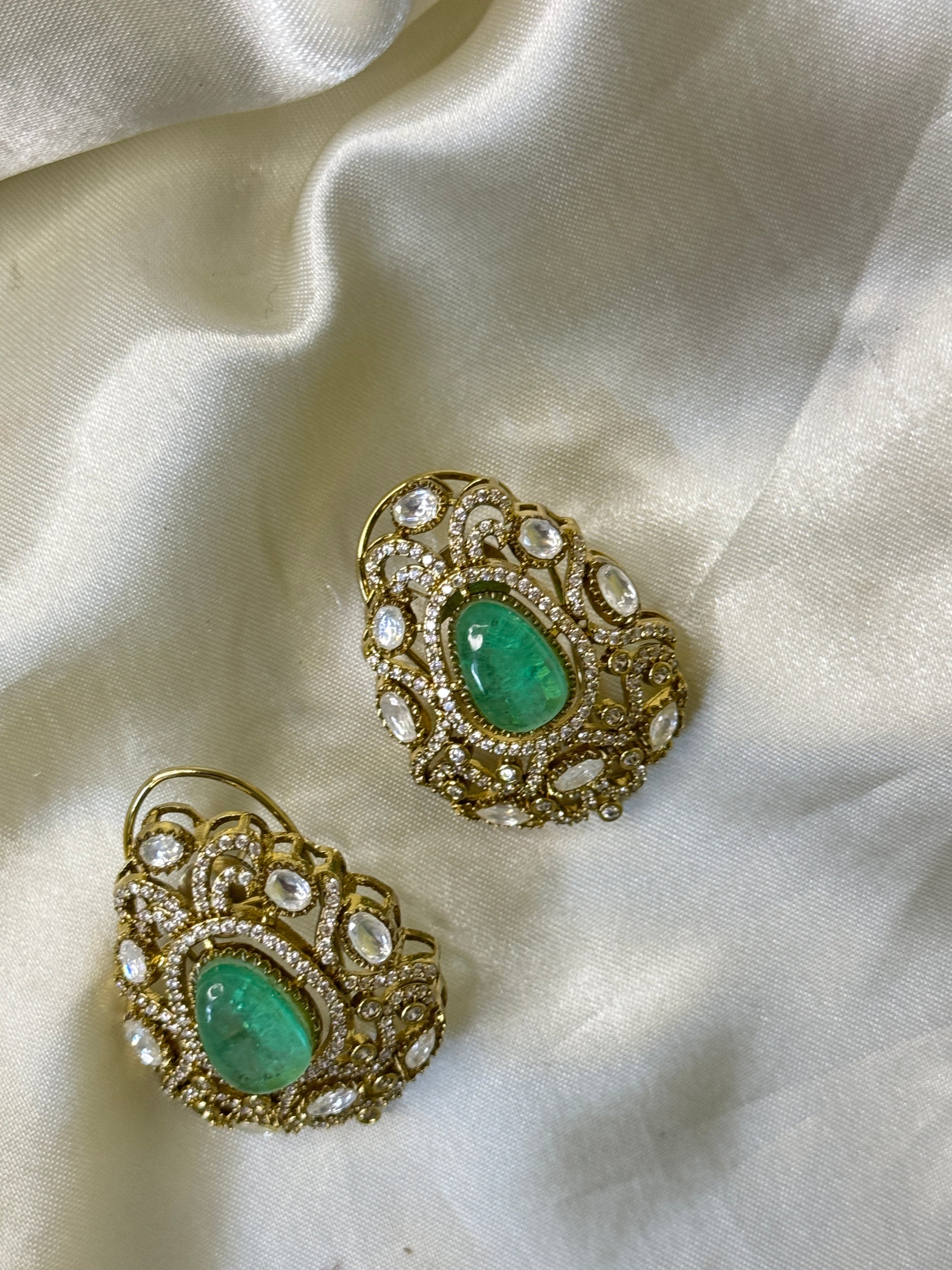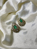 Add a touch of timeless charm with these vintage-inspired earrings, featuring a captivating green stone at the center. Designed with intricate detailing and an old-world appeal, these earrings exude sophistication and grace. Perfect for weddings, festive occasions, and special celebrations, they beautifully complement both traditional and fusion ensembles. Pair them with matching jewelry for a truly regal look.